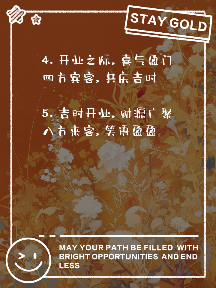 4、开业朋友圈可以这样发正式宣告开业文案“秋高气爽,时光鎏金经过紧锣密鼓的筹备,我的今日正式开业啦期待各位的光临与支持”表达祝愿文案“祝愿我的在新的一年里红红火火,日进斗金,生意兴隆,财源滚滚”分享喜庆氛围文案“锣鼓声声传喜讯,鞭炮齐鸣迎贵宾花篮装满祝愿,我的。