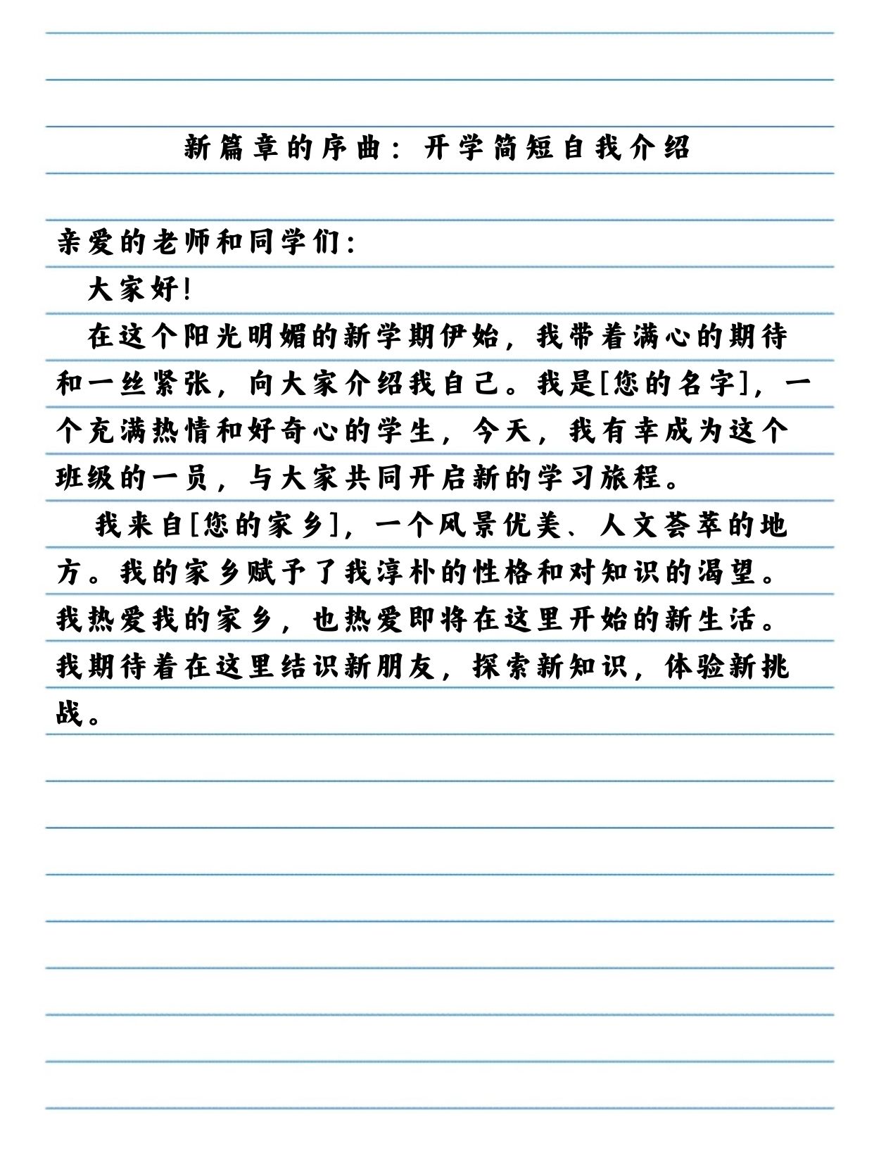 我的书法是最棒的,我在班上写的字是最好的呢!这就是我!一个大方开朗的小女孩! 在今后的生活中,我会努力和大家成为好朋友,谢谢! 高一简短自我介绍范文篇五 大家好!,我叫___,是___高中的新生 我有一张圆圆的脸,一双乌黑的眼睛,短头发我今年__岁了,不小了吧?却总也脱不掉那满脸的稚气 我;高一新生自我介绍要怎么写呢?一起来看看小编的今日分享吧高一新生自我介绍包括三个方面,首先简单的介绍一下自已的基本情况,如名字毕业的初中学校等然后选择一件具有代表性的事情,介绍一下自己的兴趣爱好性格等最后可以描述一下对高中生活的憧憬和目标高一新生自我介绍简短篇一大家好,我是_,很高兴能和大家。