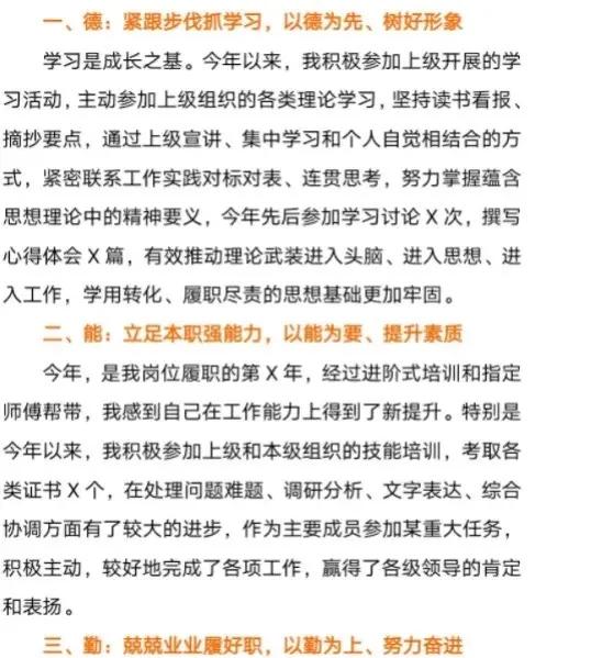 德能勤绩廉五方面的表述如下德 德主要反映一个人的思想觉悟工作作风和道德品质具备较强的事业心和责任感,尽职尽责地完成各项工作 在学习上不断进步,做人上有新境界,做事上有新成效 能够摆正自己与上级同事的关系,顾全大局,不争名夺利,不计较个人得失能 能反映一个人的综合。