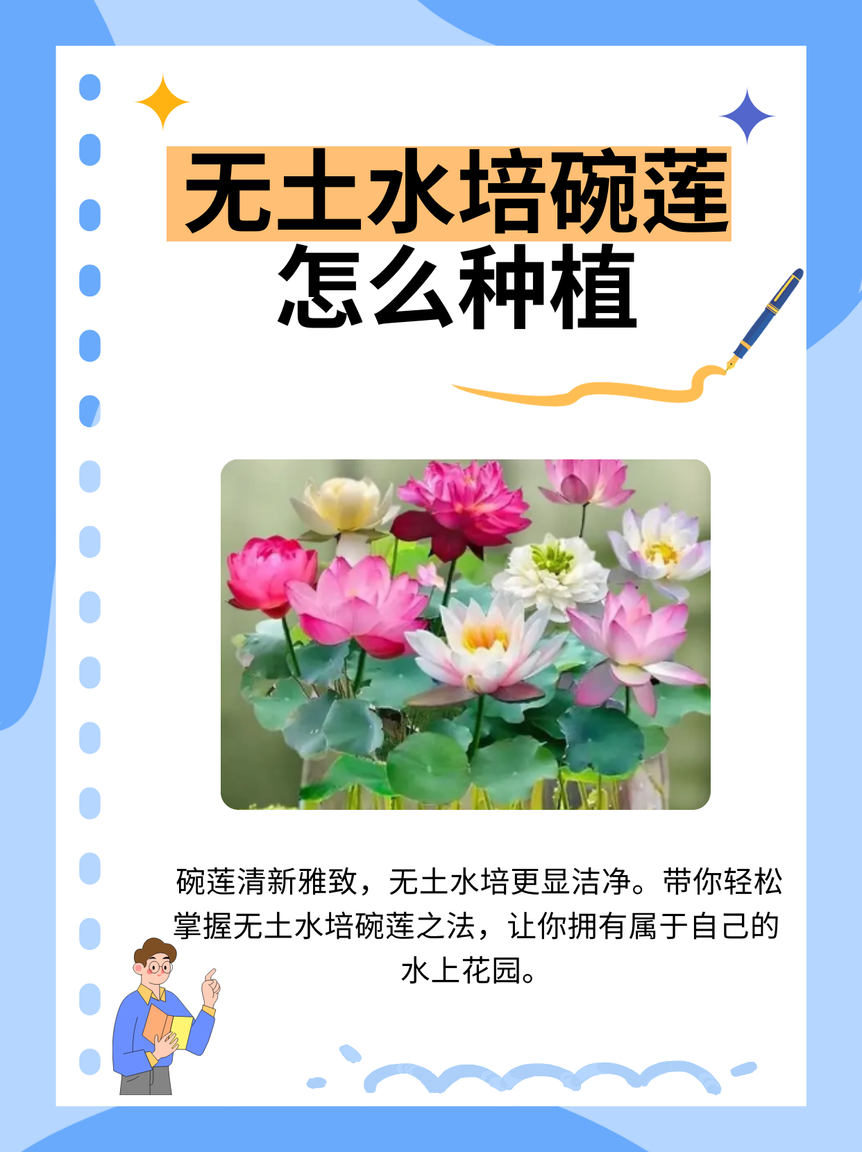 6、碗莲的水培种植方法如下种子选择与处理选择长势良好的碗莲种子将种子放置在温暖的室内,使用温水浸泡23天使用剪刀小心地将种子内部剖开,注意避开胚芽,使其内部能接触水源,便于发芽水培环境设置将处理后的种子放置在容器中,种子的凹面接触水面,以促进其生长保证良好的光照条件,水温保持在15。