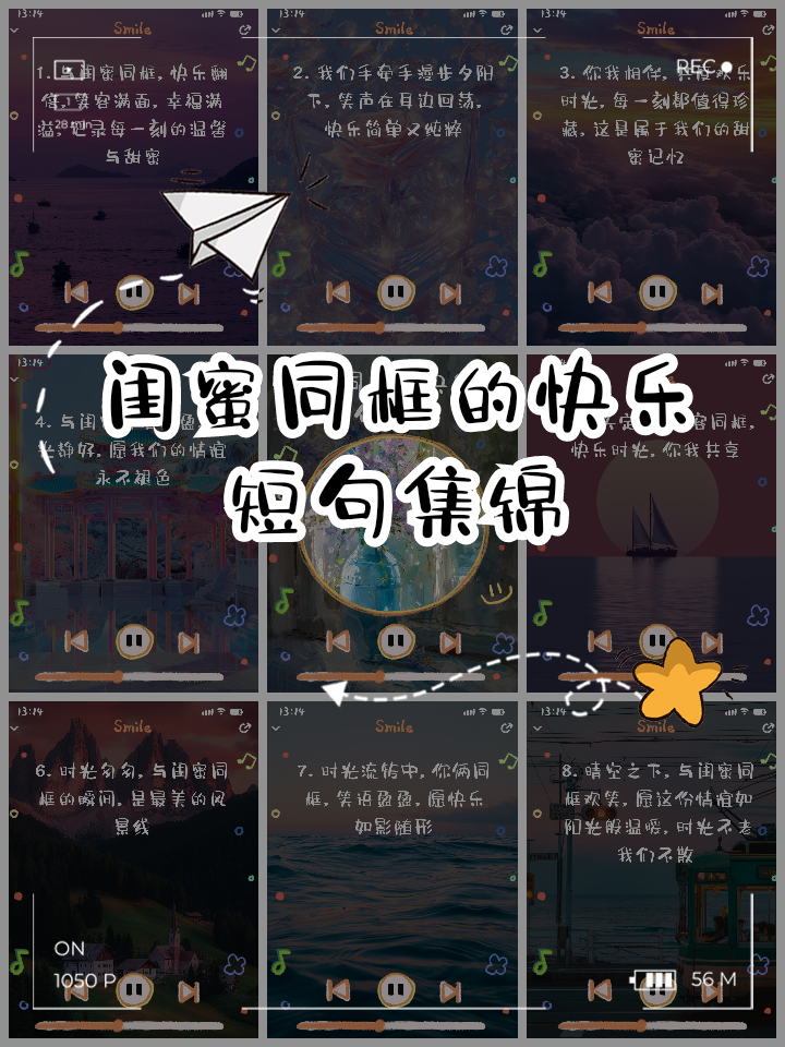 8、1懂我奇奇怪怪,陪你可可爱爱2想和你做彼此心事的靠山,想和你永远好奇又贪玩3异父异母的亲姐妹,途有好伴,不觉长远4要并肩而立一起成为更好的大人5心仪的女孩常驻身边6不是在最好的时光遇见了你们,而是有你们在,我才有了最好的时光。
