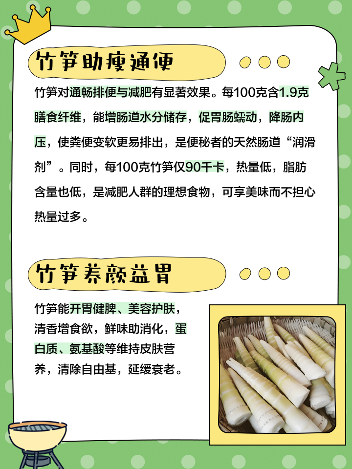 1竹笋可以开胃促消化,能够起到健脾的功效可以降血脂降血压降血糖,非常适合三高患者食用,可以起到一定的辅助治疗作用2可以润肠通便,排毒保健,减少肠道对脂肪的吸收,能够起到防治便秘预防结肠癌减肥瘦身的作用可以补充人体皮肤和肌肉的营养,保持黏膜和皮肤的正常生理状态,起到美容。