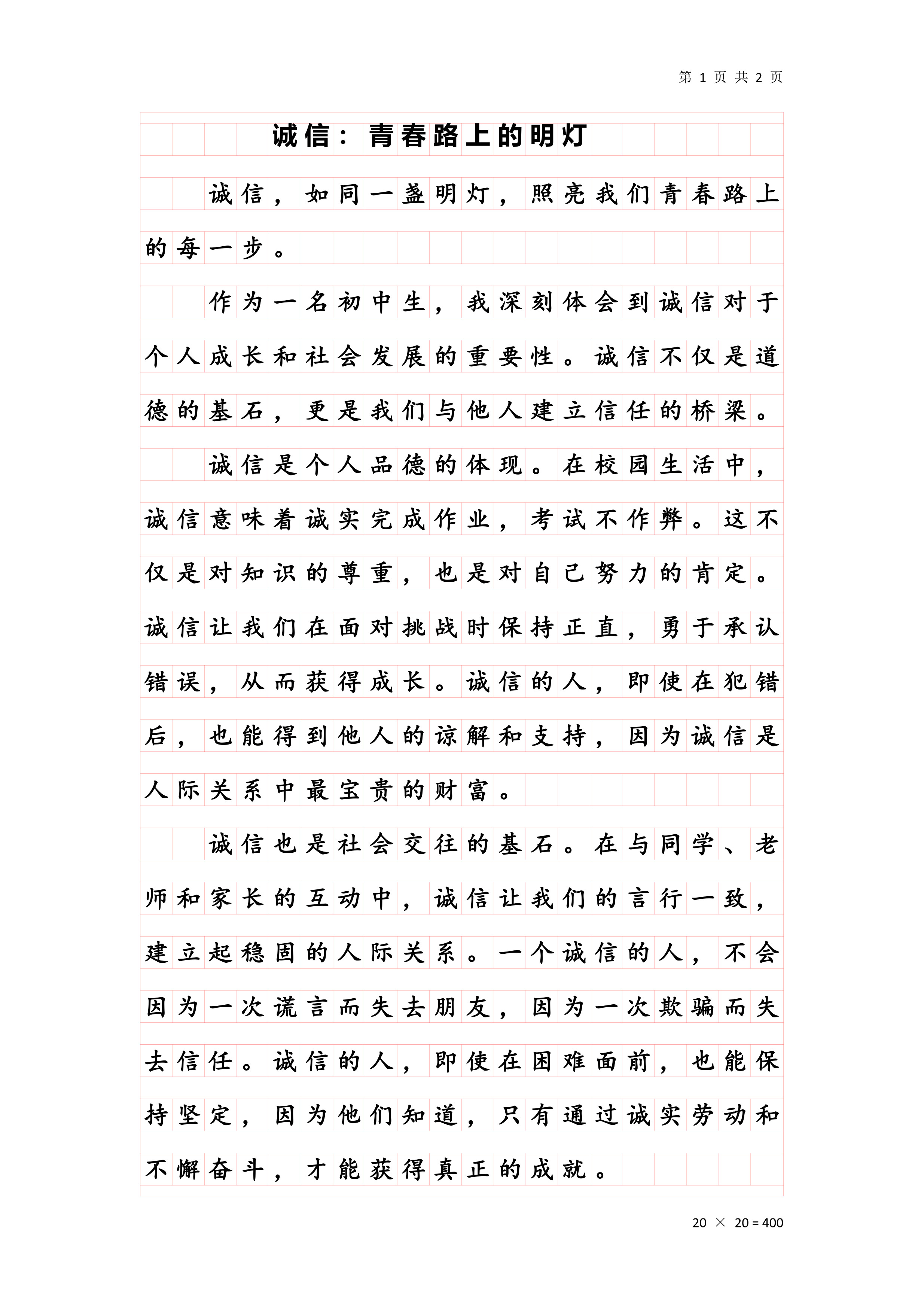 2、诚信作文800字1 诚信是最美丽的外套,诚信是成功道路的财富,诚信是做人的基本准则之一,选择诚信则是人的一生中众多选择里最正确的一个 选择诚信,因为它比美来得可靠,没有美的人生,或许是没有足够亮点的人生,但若没有诚信的人生,则是没有一丝光明的人,生下一场雨,就少几十把雨伞,诚信真的这么不值钱?两个。