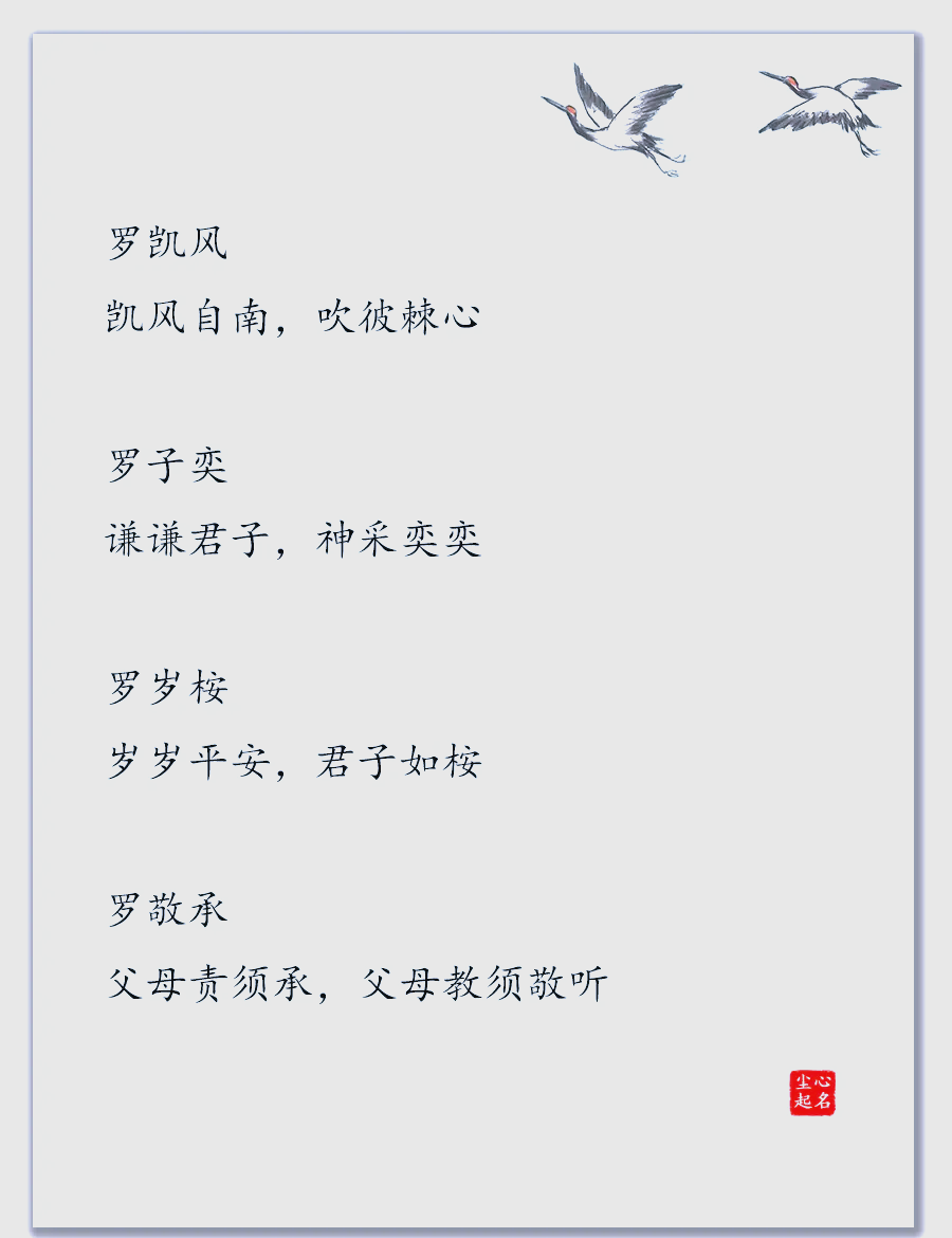 1罗熙雯运用珍宝字“熙”+女德字“雯”起名熙代表着光明,所以当用作人名时引申为乐观前途光明之义雯本义彩云指成花纹状的云彩用作人名意指美丽又有文采之义熙雯具有宽容爱感恩乐观等字义暗示,能有效的改善悲观保守的性格缺点2罗子衿借助古诗词“青青子衿。