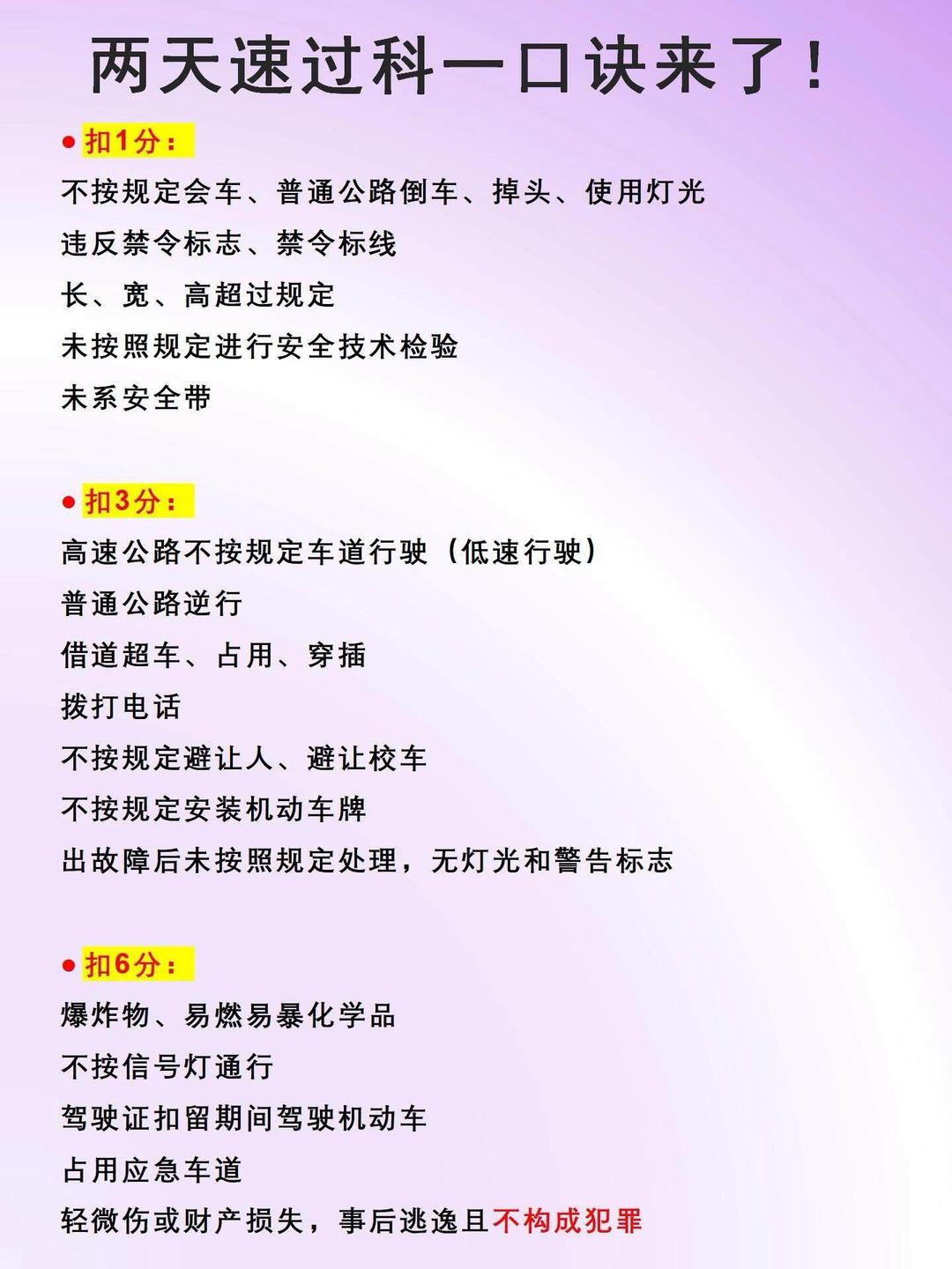 1、1限速选择题 口诀城35公47 解释城市道路没有中心线限速30公里 城市道路有中心线限速50公里 公路道路没有中心线限速40公里 公路道路有中心线限速70公里 2驾驶证吊销后重新申请的时间范围口诀吊二撤三醉五逃终生解释驾照被吊销后二年内不得重新申请驾驶证,驾照被依法撤销等三年,醉酒被;过水路,先停车,一停二看三通过 遇见鹿,是野生,遇见牛,是牲畜 黄色路牌要注意,小孩行人自行车考试需要带上身份证等文件具体向驾校询问1听从工作人员安排,在待考场顺序领取本人学车档案2携带并出示本人身份证,接受监考民警审核3进入考试区域必须关闭手机4进入考试区域不许;学车顺口溜上车喊报告拉门出左脚,坐好叫考官,面带梨涡笑关门深呼吸,坐姿要摆好查看空挡位,点火要轻柔方向别忘了,挂挡要干脆,手刹要放掉起步问考官,多看后视镜,喇叭来欢叫离合器放松,做好半连动,出发要稳当,别让考官晃换挡要及时,加挡要迅速,遇人要刹车,可别过了头。