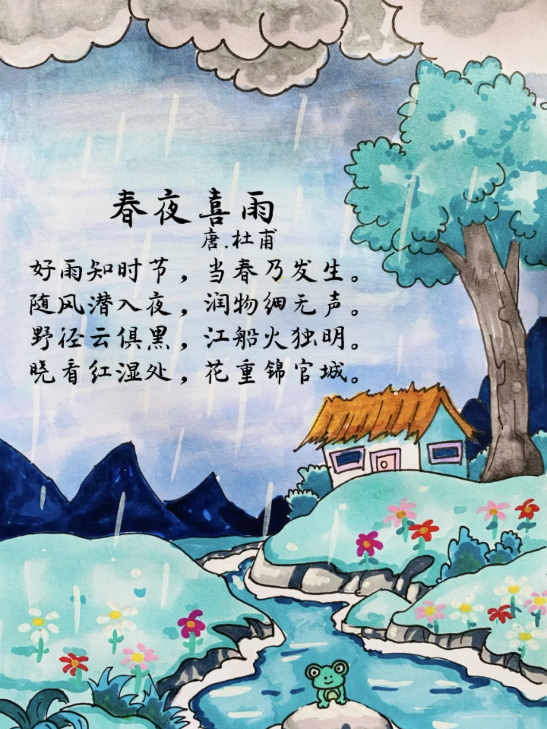 4、春夜喜雨 好雨知时节,当春乃发生随风潜入夜,润物细无声野径云俱黑,江船火独明晓看红湿处,花重锦官城题解 杜甫诗集中有五十多首写雨的诗篇,以喜雨为题的,共四首,以这一首最为知名这首诗作于上元二年761春天,杜甫这时已经在成都草堂居住了两年从上年的冬天到这年;1春夜喜雨意思好雨似乎会挑选时节,降临在万物萌生之春伴随和风,悄悄进入夜幕细细密密,滋润大地万物浓浓乌云,笼罩田野小路,唯有江边渔船上的一点渔火放射出一线光芒,显得格外明亮等天亮的时候,那潮湿的泥土上必定布满了红色的花瓣,锦官城的大街小巷也一定是一片万紫千红的景象2;春夜喜雨的意思为好雨知时节好雨似乎会挑选时辰,降临在万物萌发的春天当春乃发生在春天到来时它适时地降临随风潜入夜伴随着和风,悄悄地在夜晚降临润物细无声细细密密,无声无息地滋润着大地万物野径云俱黑浓浓乌云,笼罩田野小路,一片漆黑江船火独明只有江上渔船上的。