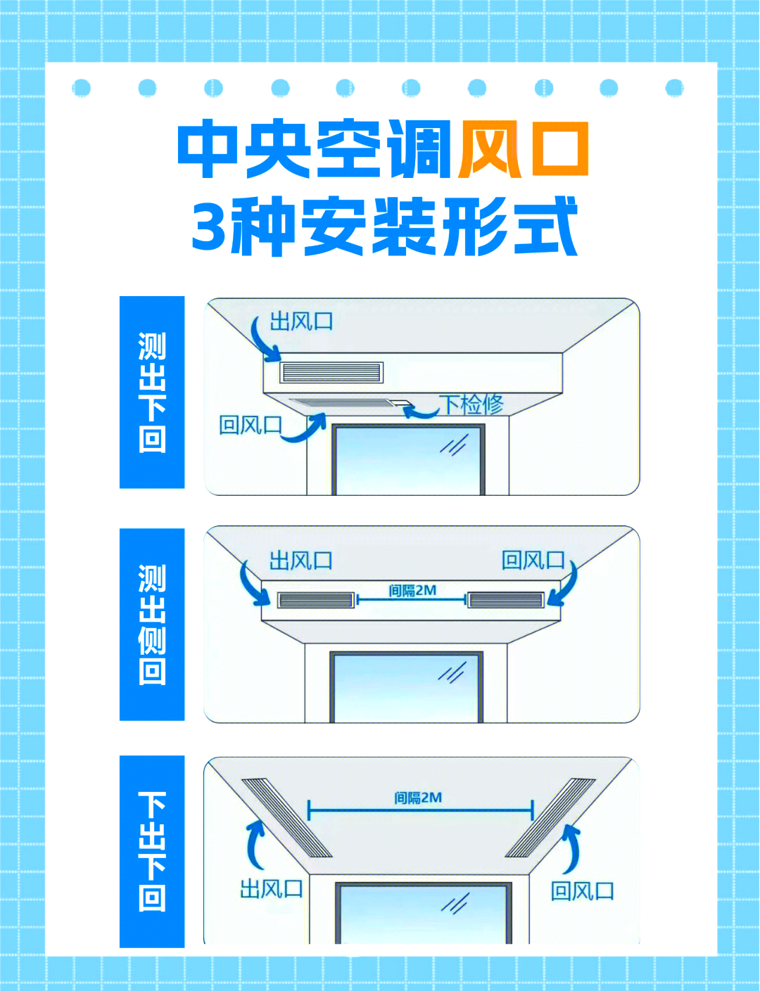 回风口尺寸回风口的尺寸通常为26cm高度*60100cm长度回风口的设计同样需要考虑室内机的尺寸和装修环境,以确保空气能够顺畅地流回空调系统检修口尺寸检修口的尺寸一般为35cm*35cm这是为了方便日后对空调系统进行维护和检修中央空调出风口设计注意事项尺寸匹配中央空调出风口尺寸的。