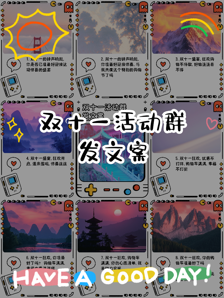 多思多劳多收获,敢打敢拼双十一 让我们一起努力,收获满满的优惠和惊喜双十一剁手,但剁得开心提前开抢活动,让你先人一步享受优惠万众一心,永不言苦,相信团队,飞跃巅峰 我们团队齐心协力,只为给你带来最好的双十一购物体验记得在发布朋友圈时,搭配一些吸引人的图片或视频,增加文案的吸引;1服装女人的真心话,从不挂在嘴上只会穿在身上 2婚庆两个人的浪漫,胜过千万人的狂欢 3鞋子脚感超级好,感脚非常棒 4美妆用心花出去的每一笔钱,都是变美的本钱 5吸尘器一键“轻”空 6酒业买得起的在购物车里,买不来的在酒里 7灯具请问哪里需要灯泡?我超亮 8母婴产品正大光明的发育,别浪费唯一的成长时光 9房地产有了家,风雨。