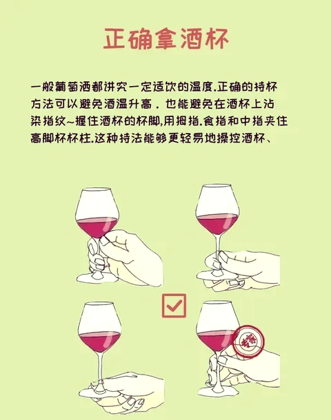 1、红葡萄酒忌与醋同饮沙拉中的醋会与红葡萄酒产生冲突,影响风味,此时柠檬水会是更好的选择 避免过量饮用每次饮用红葡萄酒不宜超过100毫升,每天不宜超过250毫升过度饮酒有害健康,会增加肝癌和肝硬化的风险以上是关于喝葡萄酒要注意的事项以及高脚杯正确拿法的详细解答;用拇指食指和中指夹住高脚杯杯柱用手拿着杯子的底座部分1用拇指食指和中指夹住高脚杯杯柱将拇指放在杯柱的一侧,食指和中指放在另一侧,用三个手指轻轻夹住杯柱这种方式可以提供稳定的支撑,使杯子不易滑落2用手拿着杯子的底座部分将手掌伸平,用拇指和食指夹住杯座,拇指压在上面;拿水晶高脚杯来说,这种杯子一般是使用渗透性良好的材料制成的,并且有许多小孔,所以很容易吸收气味因此,在清洗水晶高脚杯的时候最好采用无香型的清洁剂或小苏打但是仅仅使用清洁剂是无法将葡萄酒杯清洗干净的因此,第一次清洗葡萄酒杯的时候要使用醋或者柠檬汁清洗,并且不要把酒杯突然浸泡在低温;品鉴酒香在品尝酒之前,可以将鼻子靠近杯口,轻轻吸气,闻一闻酒的香气正确的拿法是用拇指和食指捏住杯柄,将杯子轻轻抬起,让鼻子靠近杯口,避免手的温度影响酒的香气总之,正确拿玻璃高脚杯的方法主要是握住杯柄,避免手的温度影响酒的品质,同时注意轻拿轻放,保持酒杯的清洁在品尝酒时,还。