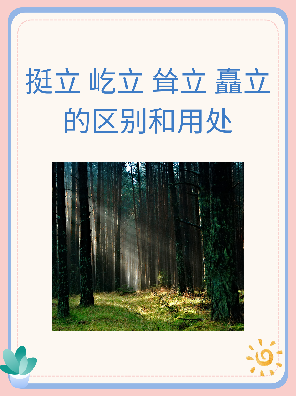 如挺拔的白杨卓立则意指高高站立,坚定不动摇高耸则表示高而直地耸立,如高耸的纪念碑矗立和耸峙也是形容高而直立,稳固不动岳立和伫立则分别有山岳般的稳定和长时间站立的意思屹立一词的含义是什么 屹立是一个汉语词语,用来形容像山峰一样高耸而稳固地立着,常用来比喻坚定不可动摇。