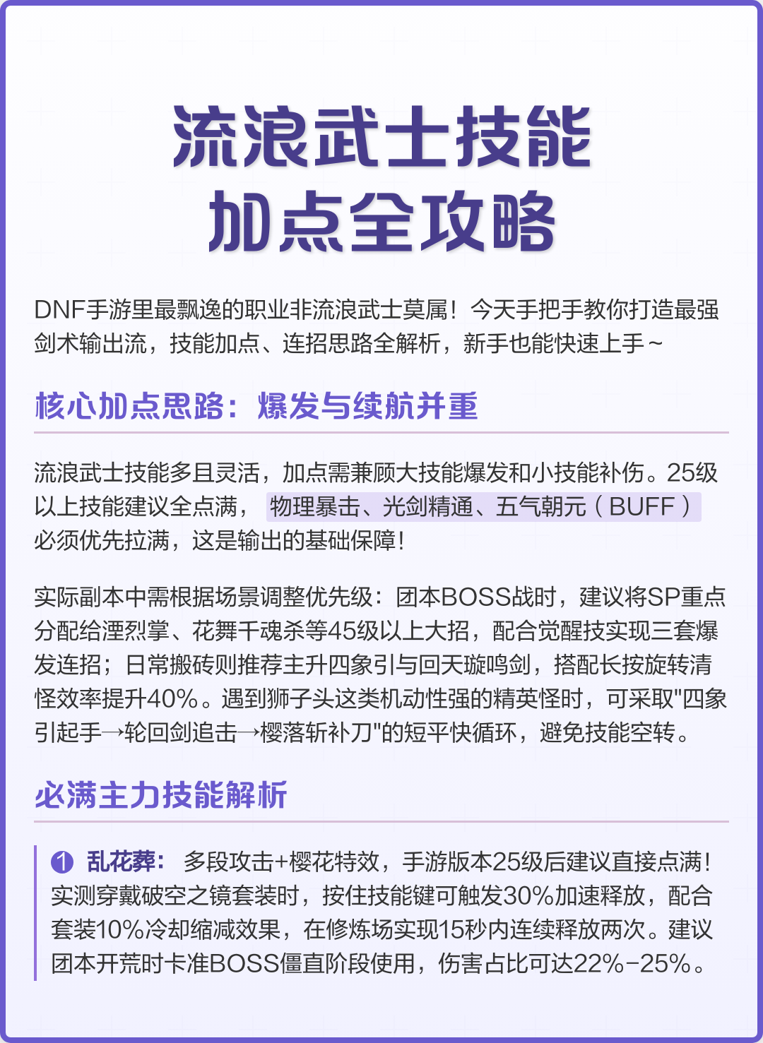 3、DNF剑帝90版本刷图加点525改版加点分析,在全新的版本中剑帝拥有不小的提升,虽然小姐姐拥有着一幅美丽的皮囊,但是她可不是花瓶哦,实力也是不容小觑的,下面给大家分享一组加点方案流浪武士这个职业主要依靠无色技能来打输出,他的瞬间爆发力度很强,那么加点方面就要注意将几个重点的buff技能全部点满;4 流浪武士技能加点攻略 技能加点是提升角色能力的关键本部分将给出流浪武士的技能加点方案,帮助玩家优化技能组合5 流浪武士勋章卖圆汪和守护珠选择 勋章卖圆汪和守护珠的搭配对流浪武士的战斗力有着直接影响这里将指导玩家如何选择最适合自己的配置6 流浪武士用光剑还是巨剑 流浪武士可以;2022年DNF流浪武士刷图加点全攻略高效刷图技巧与技能搭配 一核心技能加点策略 五气朝元作为流浪武士的核心BUFF技能,必须加满它能大幅提升角色的攻击速度和移动速度,极大提高刷图效率樱花劫高伤害技能,建议加满其范围广伤害高的特点,使其成为流浪武士清理大量敌人的利器回天璇鸣剑此;倒着点就行了 小技能点游龙掌一花渡江和碎岩裂地掌选一个自己顺手的一级连环斩跑路,十字啸空斩1级就行其他全满 逆转。