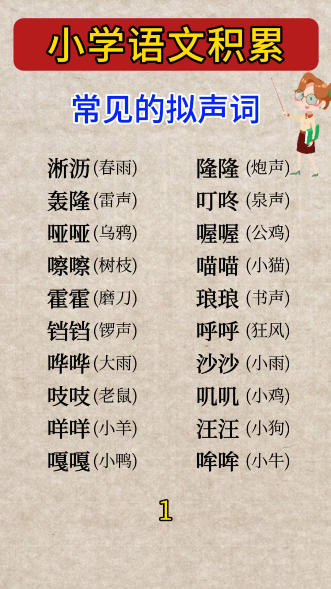 这些词语都是abab式的词语,同样也是拟声词,abab式是指前两个字和后两个字一样,拟声词就是模拟声音的词,又称为象声词摹声词状声词除此之外还有单音节的拟声词有乒乓唰轰嘭咻吱啪等双音节的拟声词有啦啦哗哗汪汪咚咚叽叽渣渣呱呱啪啪等AB型的。