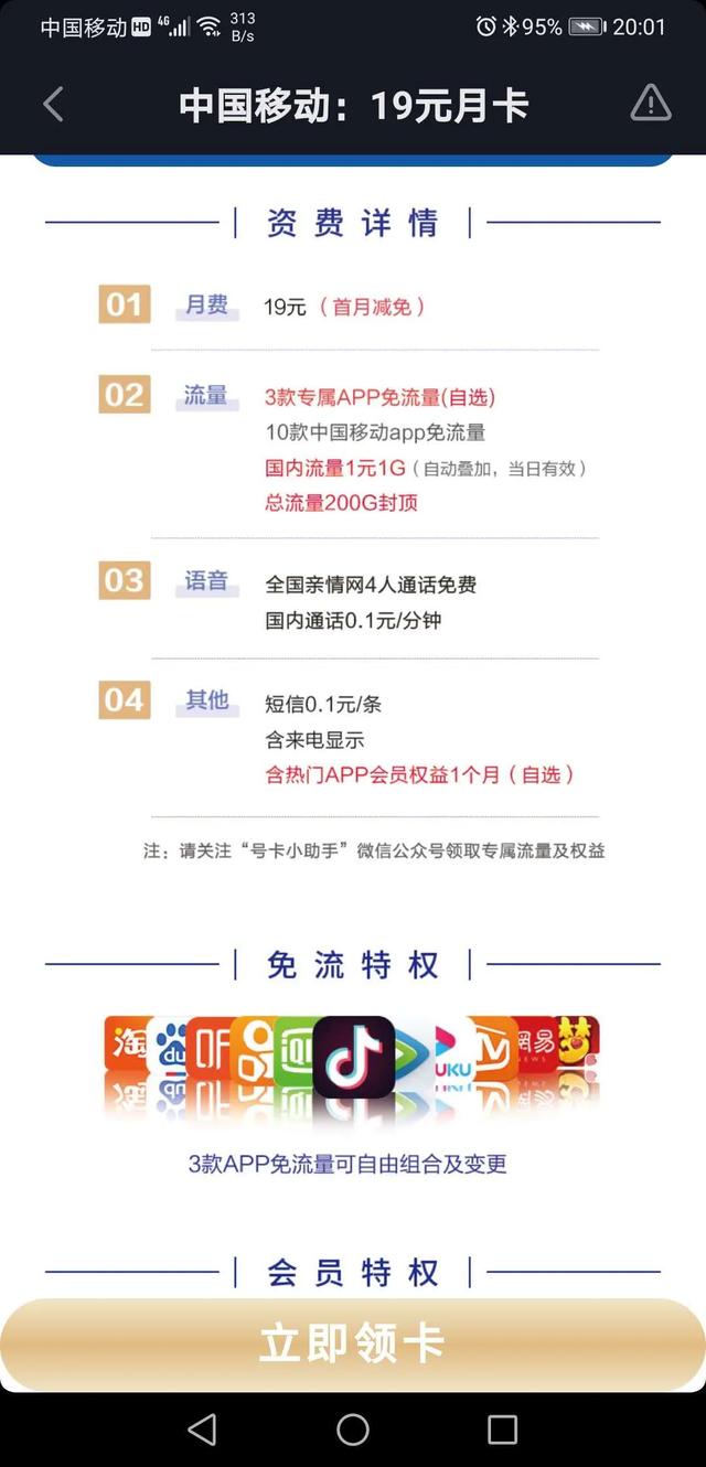 移动公司近期推广较多的是移动花卡宝藏版,每月也是19元起,三款专属APP免流量(自选)、10款中国移动APP免流量、国内流量1元/1GB/日(自动叠加当日有效)、总流量200GB封顶。资费规则基本上和联通大王卡大同小异,所谓的免流量也是噱头,只是针对专属APP提供200GB流量,由于非专属流量不易避免,消费者也要做好一个月消费49元的思想准备,这个套餐具有三款自选专属APP免流量可以有跨互联网公司的选择优势。
