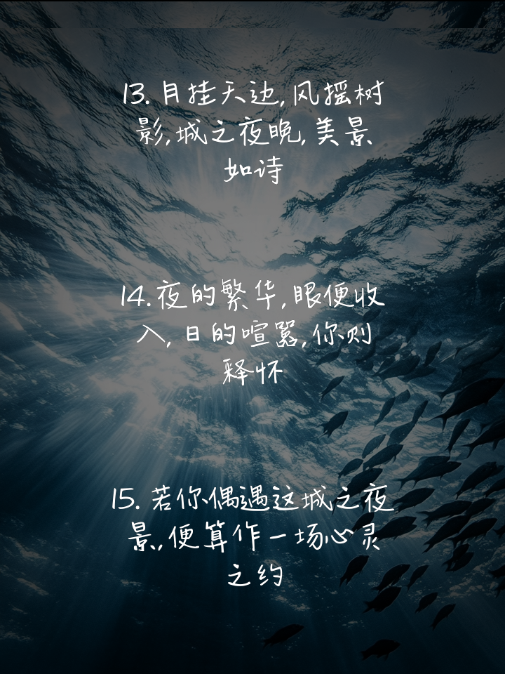 描写夜晚景色的优美句子 1夜色渐深,华灯初上,一盏盏璀璨的星光渐渐点缀了整条大街,像是被镶嵌了无数颗闪闪发亮的钻石,闪烁着迷人的光芒 2夜幕降临,星空闪烁,无尽的银河倾洒天际,仿佛一曲悠扬的旋律在黑暗中奏响 3夜幕降临,城市的灯光亮起,像是天上的星星降落人间,点缀了这座城市的每一个角落 4月色如水,轻轻洒在窗前,窗外的世界仿佛被披上了一。