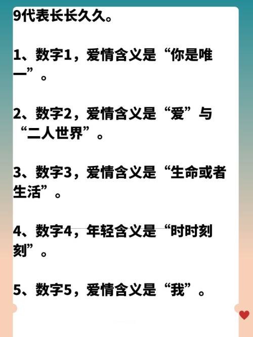 2、2 数字9901902903908913922923数字9常用于祝贺新人爱情长久,古代则用于象征皇帝,即“九五之尊”数字9在五行八卦学中属水,能带来平和安稳和兴盛的运势车牌号中有数字9,尤其是数字9较多或放在结尾,可带来贵人运,象征前途无量3 数字8812816820822826830;五行八卦中,9属水,能够消解一切磨难,代表着好运滚滚而来的趋势,爱情上长长久久,事业上长久富贵 车牌号0到9吉凶3 数字0到9的含义 0到9在易经里代表12为木,34为火,56为土,78为金,90为水五行再分阴阳,13579为阳,24680为阴数字1为阳木;所以,822爱情数字意味着对爱情的美好和幸福的期望这个词汇在情侣间常用于表达爱意,经常被用来表达祝福和庆祝爱情的美好。