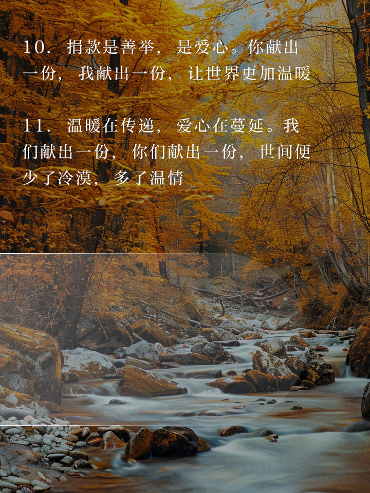 3、公益捐款文案短句干净1人生是花,而爱是花蜜,雨果1慈善公益人人参与,奉献爱心从我做起,20人间自有真情在,爱心捐款暖每人献上一片爱心,世界将会变得更美好, 我们可以通过感恩的桥梁,走向光明的未来, 慈善只有精彩关爱情,爱心永相伴, 捐出一份爱心,奉献一片真情, 倡导无私奉献新风尚,谱。