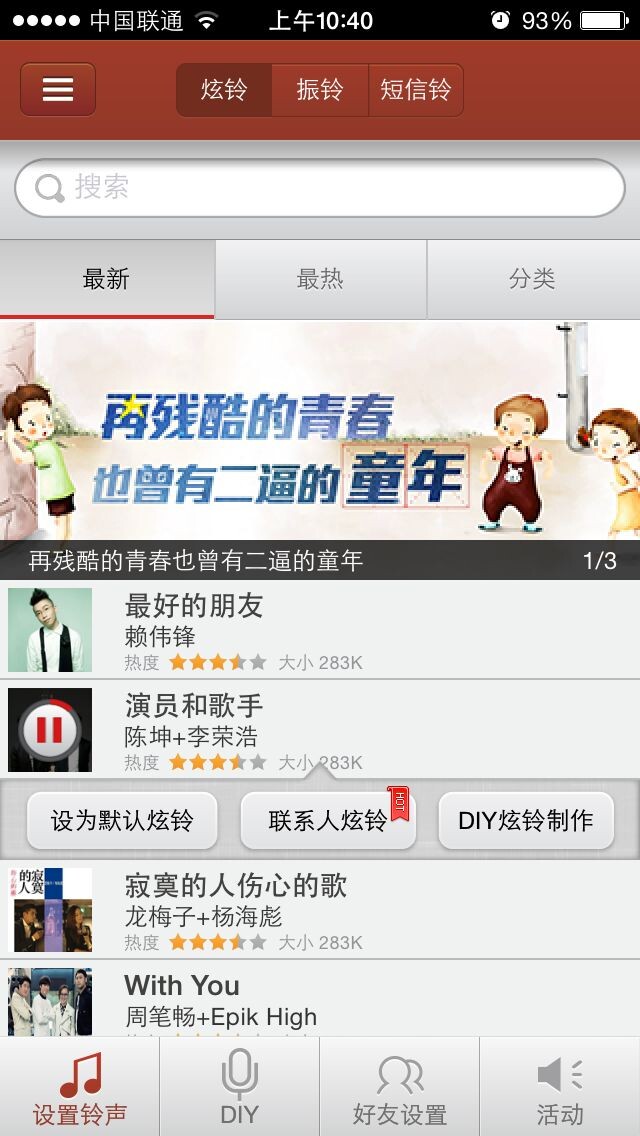 4、在炫铃DIY首页点击“设置来电铃声”按钮,进入在线来电铃声列表选择一首铃声后,下拉菜单中会显示设置方式按钮,按照提示进行操作即可完成设置通过以上步骤,您就可以成功设置自己编写的联通炫铃了。