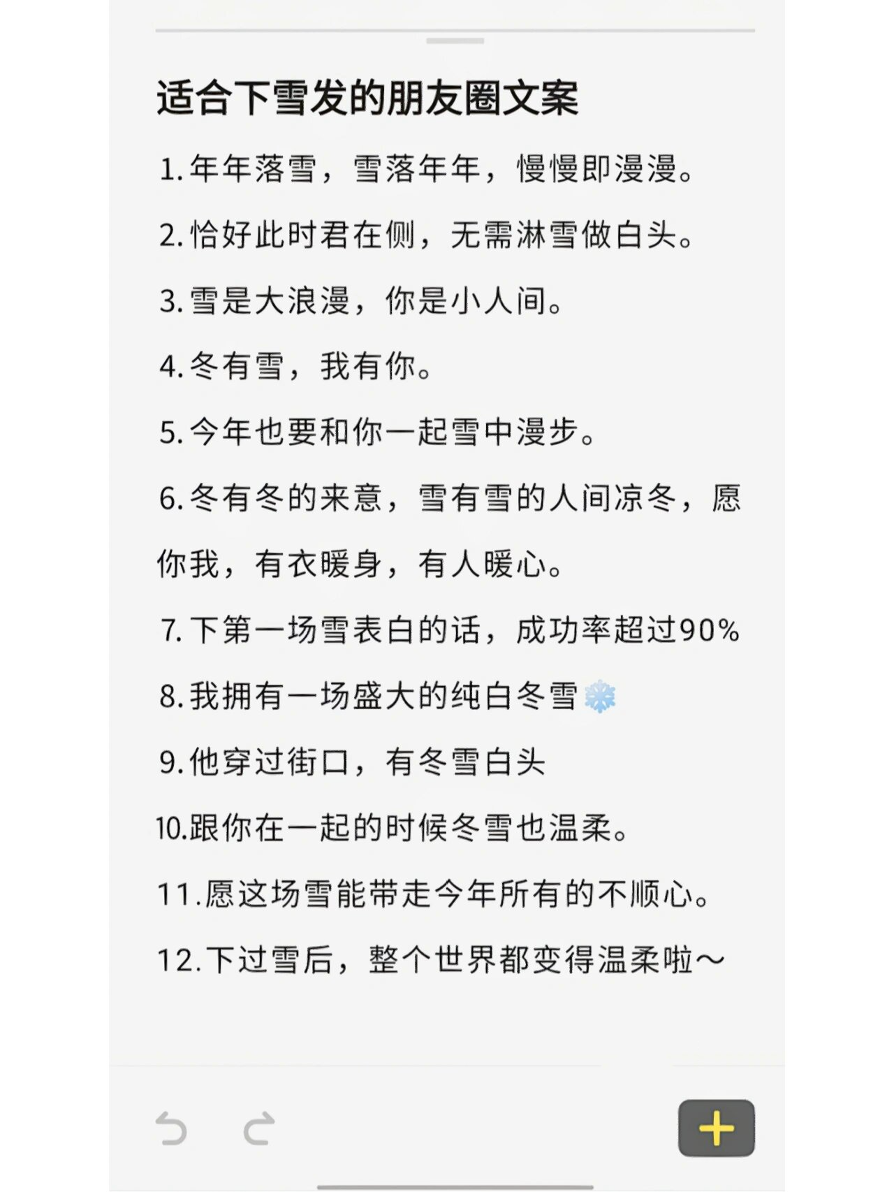 8思念是一场大雪,每一片雪花都是你 9初雪到了,爱的人在路上 10我堆的雪人想见你,它等不了太久 5幽默风趣的下雪天朋友圈文案 1冬天的第一场雪来了,奶茶也喝了,栗子也吃了,烤地瓜也在怀里啦 2霭霭夜,皎皎月,你是心中雪 3下雪了很冷,但是想起你便是温暖 4和你一起看第一场雪,你看雪,而我看你;第一场雪发朋友圈,可根据不同风格选择文案,以下为你详细介绍诗意浪漫型这类文案充满文艺气息,能营造出唯美的氛围比如“每一朵雪花,都是冬日寄来的温柔信笺”,将雪花比作信笺,赋予了冬日浪漫的色彩“雪落无声,却铺满了,我对你的思念”,以无声的雪寄托深深的思念“霭霭夜,皎皎月,你。