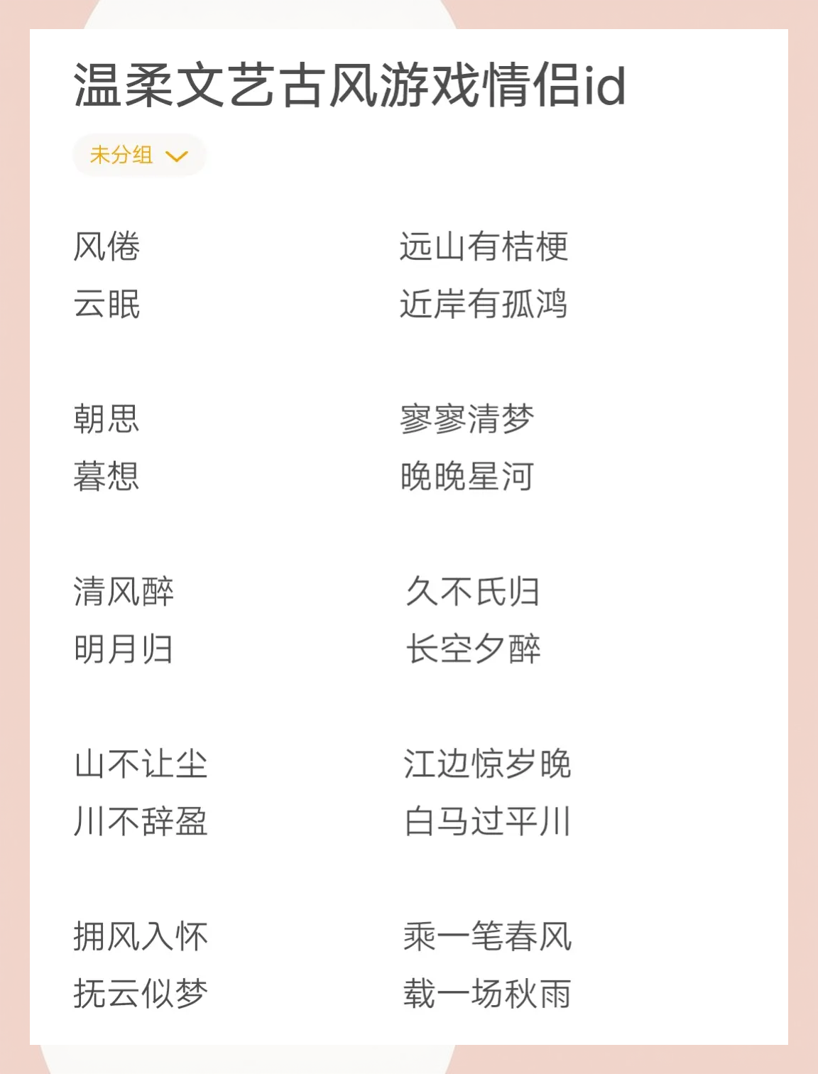 4、6谁为他昨日你来我经年在这对情侣网名中,“昨日”和“经年”真的是表达的太形象了,这也让我们看到了彼此之间对感情的重视7春日暮野 夏日溪谷8清醒 困意9想入 非非10入目无别人 四下皆是你11花卿颜慕君年在起古风情侣网名时,加入这个元素,简直是太浪漫了12;古风情侣游戏名许多喜欢玩这类游戏的玩家也喜欢古风的游戏名字,所以一对情侣玩这类游戏就来看看小编为大家推荐的这些01匣锁昔年妆花葬旧时颜02smal恋爱smal爱恋03良心良心凉的是心上心上心伤的是心04惊了时光慌了时间05离人梦;以下是一些古风富有诗意的情侣游戏名,以及好听的古风情侣网名凤归兮求其凰 灵感来源于古代对凤凰的崇拜,寓意情侣间如同凤凰般和谐美好比翼盟连枝愿 “比翼双飞”和“连理枝”都是古代爱情的美好象征,寓意情侣间心心相印,不离不弃渡鹤影葬花魂 融合了自然元素与诗意,鹤影渡水,花魂葬月;整体富有气势与情感聆听雨与挽清风聆听雨声代表着静谧与思索,挽清风则象征着洒脱与自在,两者相互呼应北冥有鱼与南海有鸢北冥之鱼与南海之鸢分别代表着自由与高远,整体富有想象力与仙气这些情侣名都充满了古风韵味与仙气,既儒雅又不失浪漫,适合喜欢古风文化的情侣使用;以下是一些好听且带有古风气质的情侣游戏昵称推荐1 爱人怎离 伊人怎弃 这两个昵称蕴含深情,表现出情侣间的不离不弃,古风韵味十足2 空城旧梦失辞人 满城风雨寻失辞 一对充满诗意与故事感的昵称,表达了对逝去时光的追寻与怀念3 等来年 秋风起 简洁而富有意境,寓意着等待与相遇。