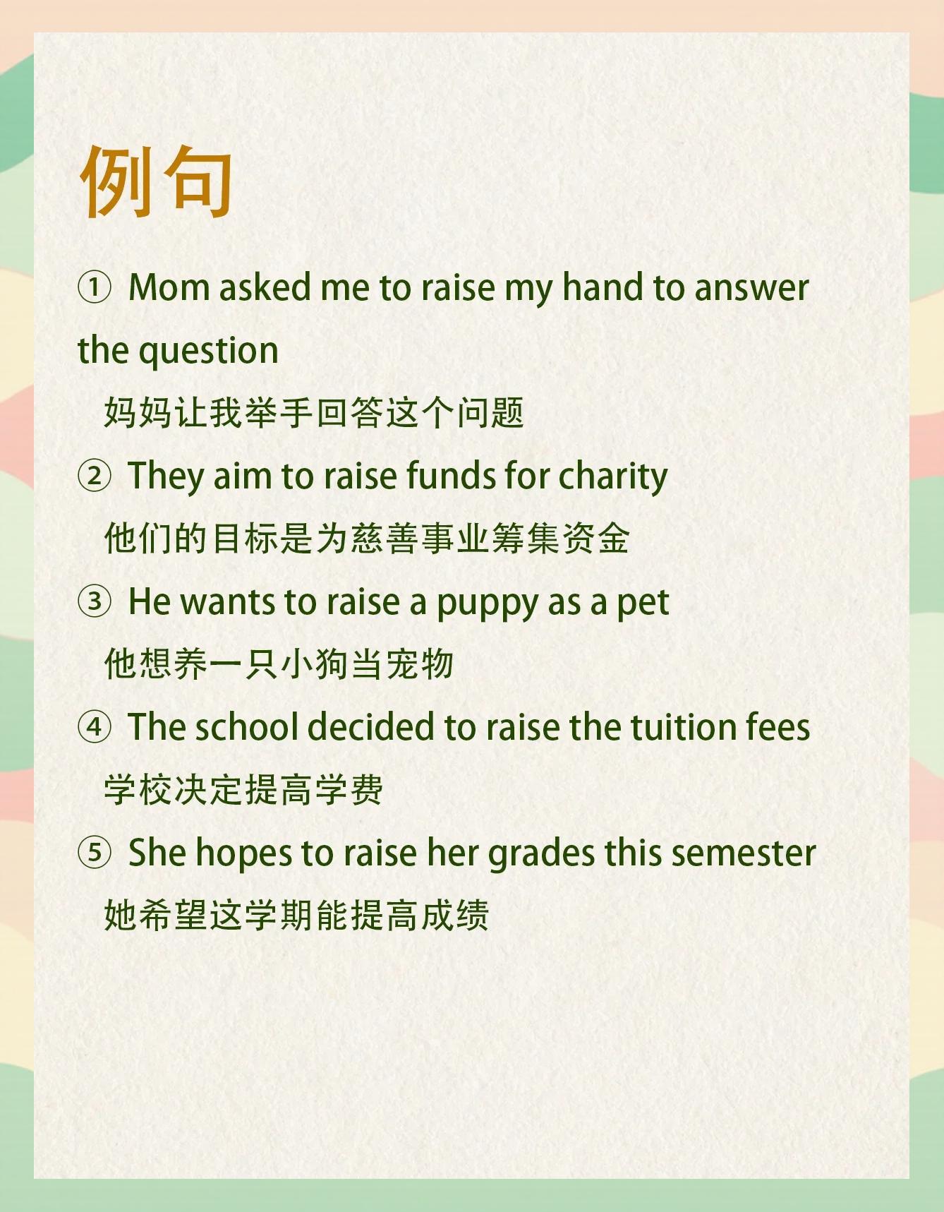 4、rise和raise在结构和用法上的主要区别如下一词性及用法 rise不及物动词,表示“上升升起”等动作,强调的是主语本身的动作或状态的变化,后面不能跟宾语例如,“The sun rises in the east”太阳从东方升起这里“rise”描述的是太阳自身的动作raise及物动词,表示“举起;主要区别1 词性不同raise主要用作及物动词,可以表达提升举起饲养等动作而rise主要用作不及物动词,表示升起起身等动作2 语境不同在描述物体从低处到高处移动时,如举高手或提升温度等,常用raise而描述太阳升起河水上涨等自然现象的上升过程时,则常用rise详细解释raise作;raise和rise在用法上的区别如下及物性与不及物性raise是及物动词,需要搭配宾语使用,表示“把某物举起来”或“使某物上升”例如“He raised his hand in class”rise是不及物动词,后面不能加宾语,表示“自己升起来”或“自然增长”例如“The sun rises in the east”词性与用法。