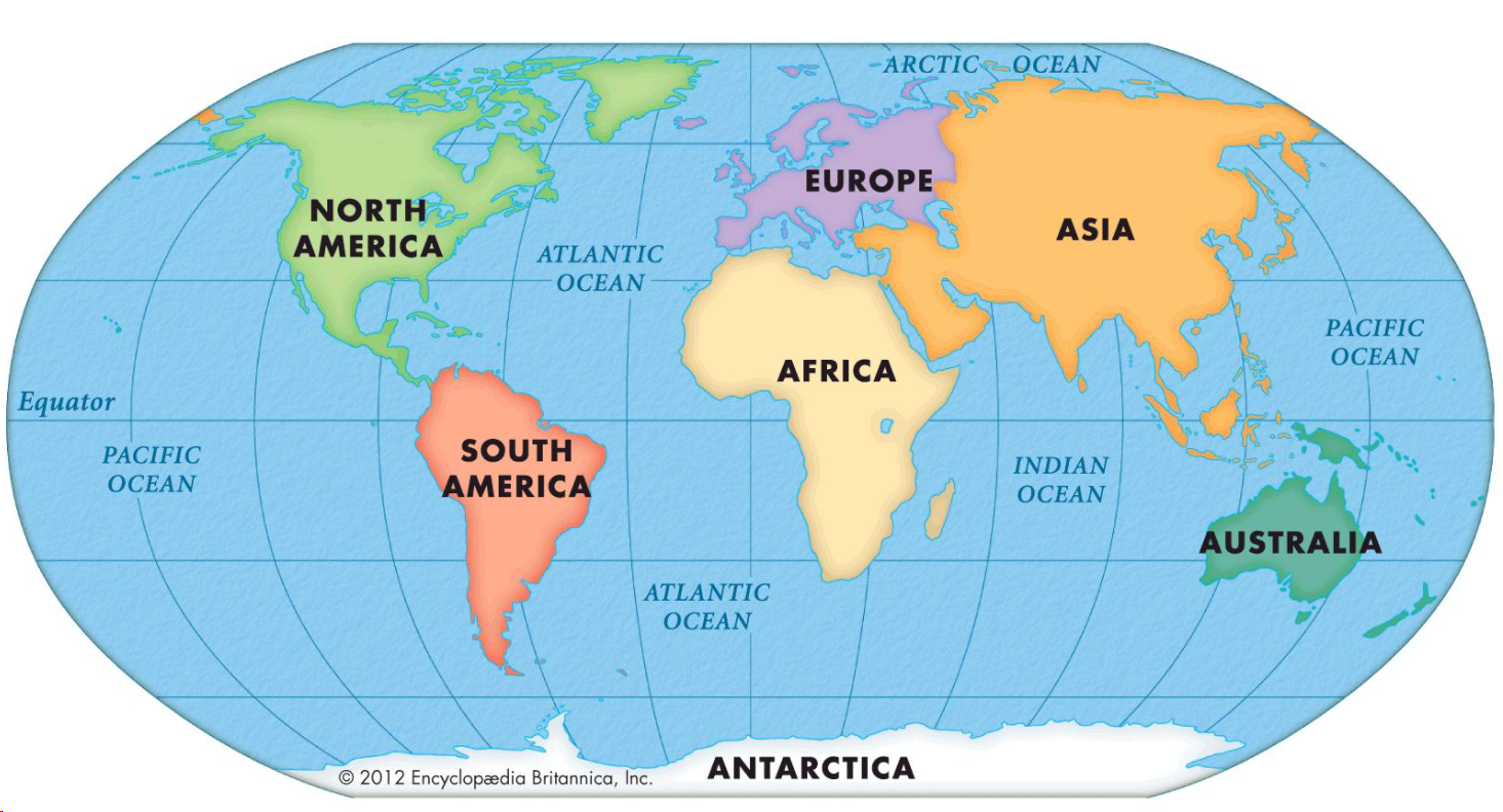 四大洋太平洋大西洋印度洋和北冰洋 four oceans Pacific, Atlantic Ocean, Indian Ocean and Arctic Ocean七大洲 亚洲大洋洲欧洲非洲北美洲南美州和南极洲seven continents Asia, Australia, Europe, Africa, North America, South America and Antarctica。