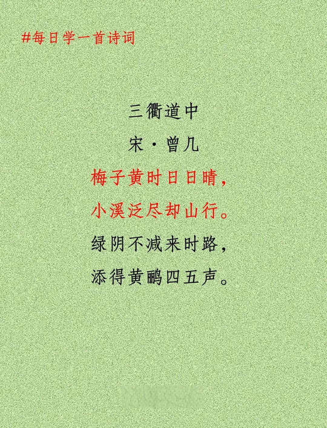 三衢道中 曾几 梅子黄时日日晴,小溪泛尽却山行绿阴不减来时路,添得黄鹂四五声题解曾几10841166,字吉甫,号茶山居士,河南今河南洛阳市人其先人居赣州今江西赣县入太学,后任将仕郎,赐上舍出身曾做过江西浙江的提刑官主张抗金,为秦桧排斥,被迫去职秦桧。