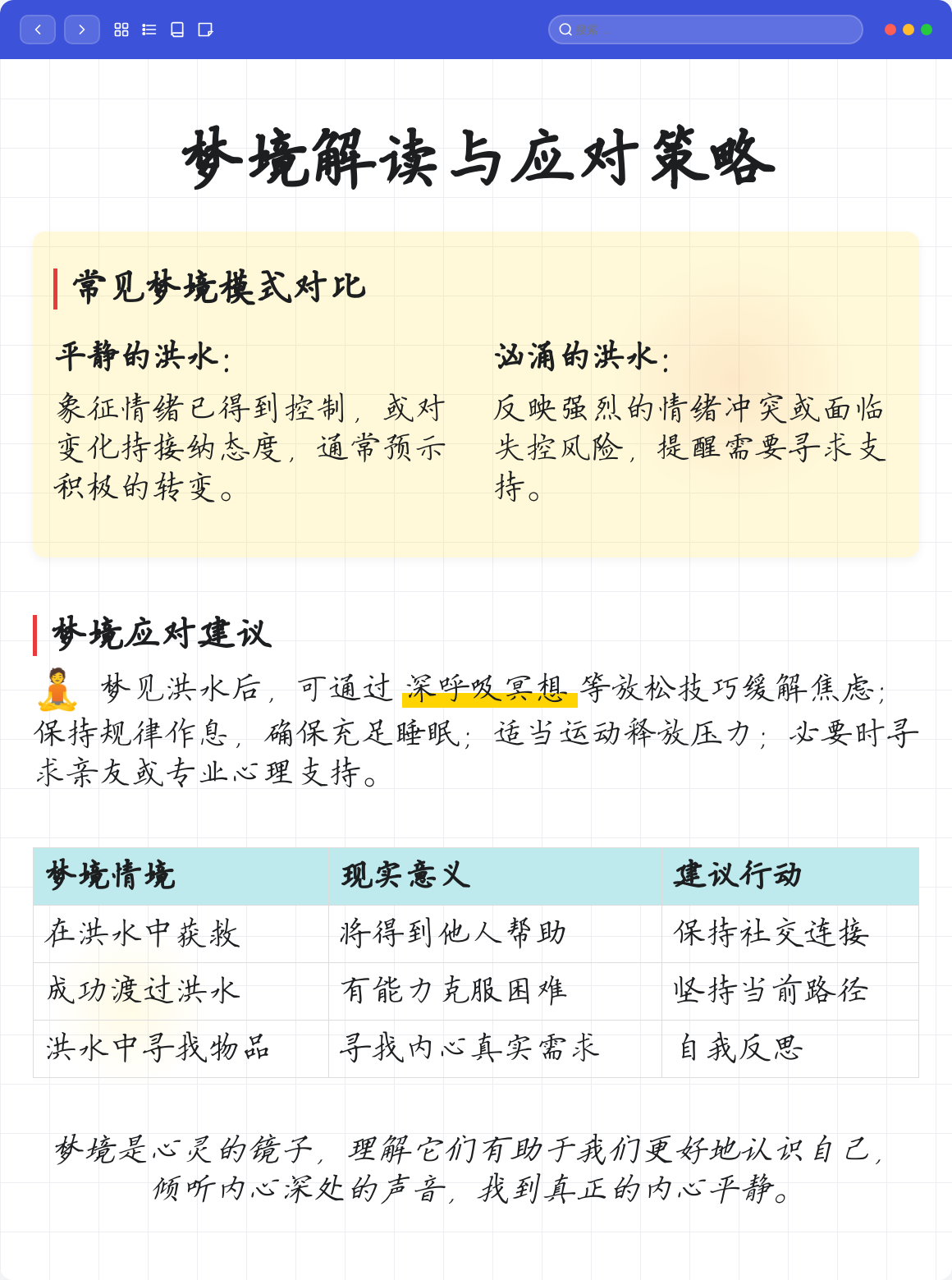 并从挑战中寻找成长的机会总的来说,梦见涨洪水并不是一个简单的预兆,其含义取决于梦中的具体情境以及你个人的生活经历在分析梦境时,重要的是结合自己的生活实际和情感状态来理解其中的象征意义这样的梦境是一个提醒,帮助你更好地认识自己,并准备应对生活中的挑战和变化。