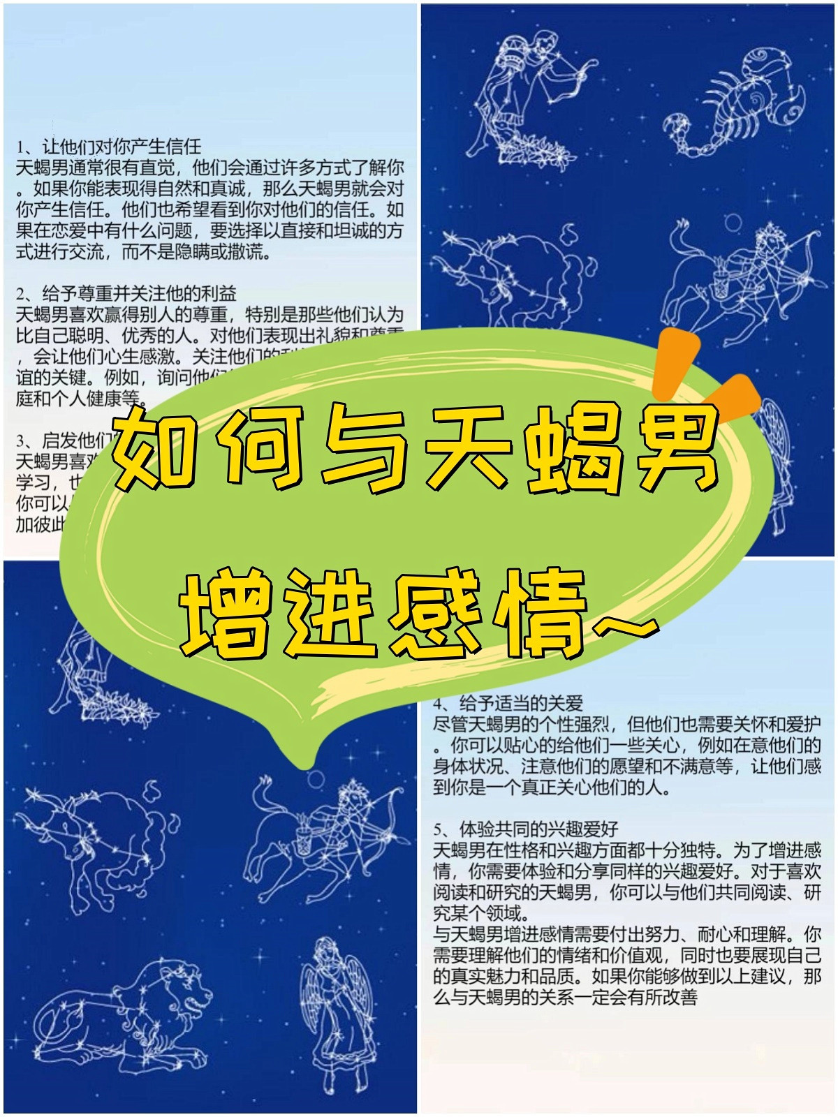 二让天蝎男爱上你的绝招1想要让天蝎座的男孩对你越来越爱,那么我们就要成为那个温柔可人的女孩,我们将要成为那个善解人意的女孩,我们就要那个成为会照顾人的女孩,因为天蝎男他最喜欢这样的女孩,如果我们变成了这样的女人,还怕他不会爱上你吗?2天蝎座的男孩,他的戒备之心是非常重的,所以。