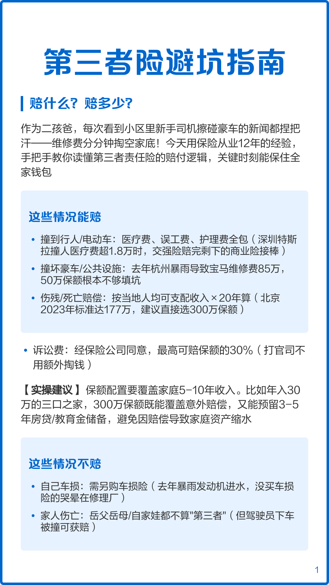 8、在交通事故中,第三责任险的赔偿情况是这样的当第三者因车祸不幸去世,第三责任险的赔偿上限为50万然而,实际赔偿金额会受到免赔额的影响如果未购买免赔额,保险公司会扣除赔偿金额的30%,超出部分将由个人承担根据保险条款第四条,当被保险人或其授权的驾驶员在使用保险车辆时发生事故,导致第。