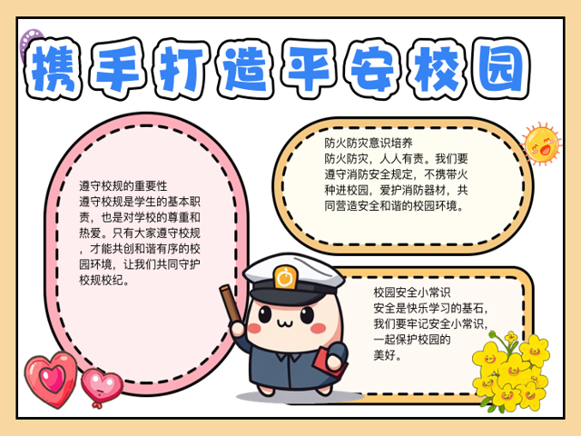 2、平安校园手抄报的内容可以以校园安全为主题,强调校园安全的重要性,校园消防事故三个角度描写1校园安全 校园安全与每个师生家长和社会都有着密切的关系从广义上讲,校园事故是指学生在校期间,由于某种偶然突发的因素而导致的人为伤害事件就其特点而言,一般是因为责任人疏忽大意过失失职而不是因为;校园安全手抄报内容如下1不要推不要挤,关心别人爱自己2上楼下楼靠右走,遇到混乱手牵手3若以追跑为开心,将以后悔而伤心4玩耍嬉戏要当心,安全警钟常在心5校园安全你我他,高高兴兴上学来,平平安安回到家 抢首赞 评论 分享 举报 为你推荐特别推荐 华强北的二手手机是否靠谱? 癌症的治疗;1将安全牢牢的记在心中,平安将会伴随我们渡过美好的一生2安全记在心,平安走天下3道路牵着你我他,安全系着千万家4平安比什么都 重要5平安,平安,平平安安,人人平安,家家欢喜6高高兴兴上班学,平平安安回家7校园是我家,平安靠大家8我爱我们的祖国,因为是;关于校园安全的手抄报内容,可以包括以下几个方面一行走安全常识 指挥灯信号绿灯亮时准许行人通行黄灯亮时不准行人通行,但已进入人行道的行人可继续通行红灯亮时不准行人通行黄灯闪烁时,行人须在确保安全的原则下通行 人行横道信号灯绿灯亮时准许行人通过人行横道绿灯闪烁时不准;24 创建“平安校园”,构建和谐 平安建设校园手抄报内容 一消防安全知识 火警电话是119,报警时应讲清起火的具体地址,火势,什么物质燃烧等等消防栓周围十米内严禁堆物,十五米内不准停车消防工作的方针是预防为主,防消结合防止烟气中毒最简便的方法是用湿毛巾捂住口和鼻浓烟下采用低;我做过的校园安全手抄报内容上要有校园安全的重要性,校园安全的基本原则,校园安全的法律法规和校园安全小常识,以及遇到校园安全问题的处理方法 2 评论 分享 举报 为你推荐特别推荐 “网络厕所”会造成什么影响? 华强北的二手手机是否靠谱? 新生报道需要注意什么? 癌症的治疗费用为何越来越高? 等你来答 换一换 “闺蜜装”如。