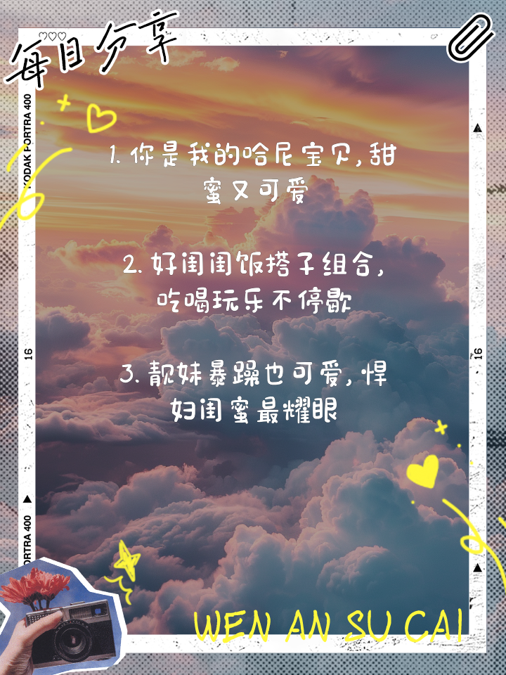 5quot一个肥婆quot虽然听起来有点粗鲁,但也许是在开玩笑中表达对闺蜜身材的接受和亲昵6quot比以前懂事了quot这个外号反映出闺蜜的成长和变化7quot灭蝇师太quot这个有趣的外号可能源于某个特定的趣事或习惯8quot奶气兔叽quot这个昵称充满了童真和可爱9quot神病院VIP病人quot这个外号带有。