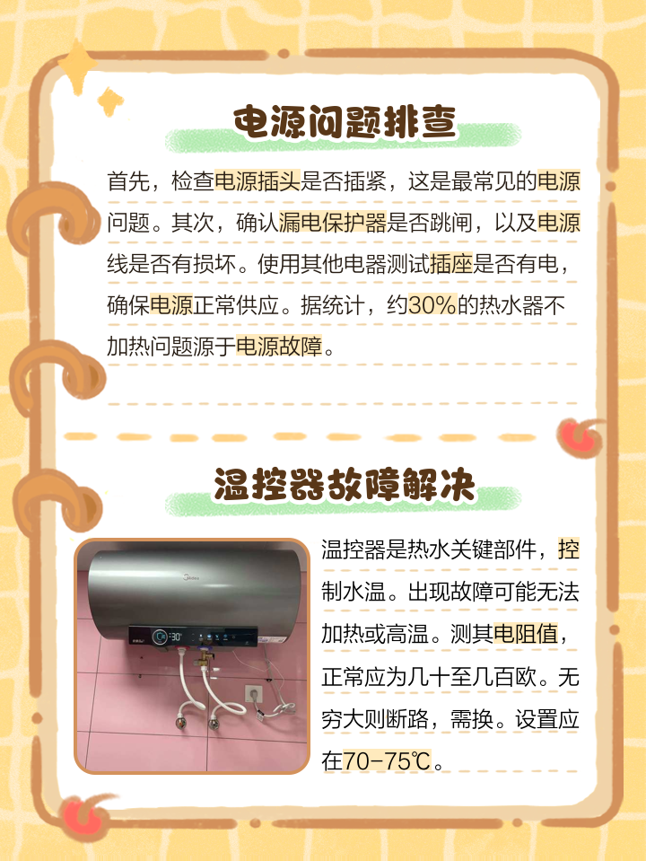电热水器有电不加热,核心问题通常集中在内部零部件故障或线路接触不良1 最常见原因加热管老化或损坏 电热水器的加热管长期浸泡在水中,容易出现水垢堆积或烧断若热水器显示通电但不出热水,首先考虑加热管故障,需用万用表检测阻值,若阻值异常则需要更换2 温控器失效导致保护性断电 当。