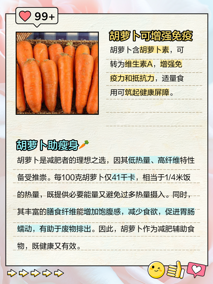 生吃是最简单也最健康的做法只需洗净后切成合适的大小即可食用为了更好地保持营养,建议食用前不要削皮或切得太细如果觉得口感较硬,可以将水果胡萝卜和沙拉其他食材混合食用制作炒菜时,水果胡萝卜可以与各种食材搭配,如炒肉丝炒鸡蛋等将水果胡萝卜切成丝状或块状,与其他食材一同翻炒,不仅。