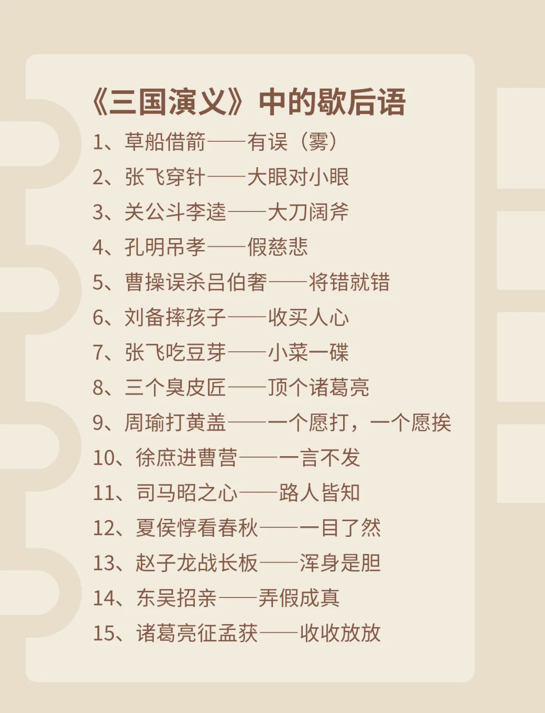 四大名著中人物的歇后语 三国演义诸葛亮吊孝装模作样 诸葛亮征孟获收收放放 诸葛亮弹琴计上心来 诸葛亮弹琴计上心来 诸葛亮的鹅毛扇一?一神妙莫测 诸葛亮三气周瑜略使小计 诸葛亮草船借箭用的是疑兵计 诸葛亮挥泪斩马稷顾全大局 诸葛亮当军师名副其实。
