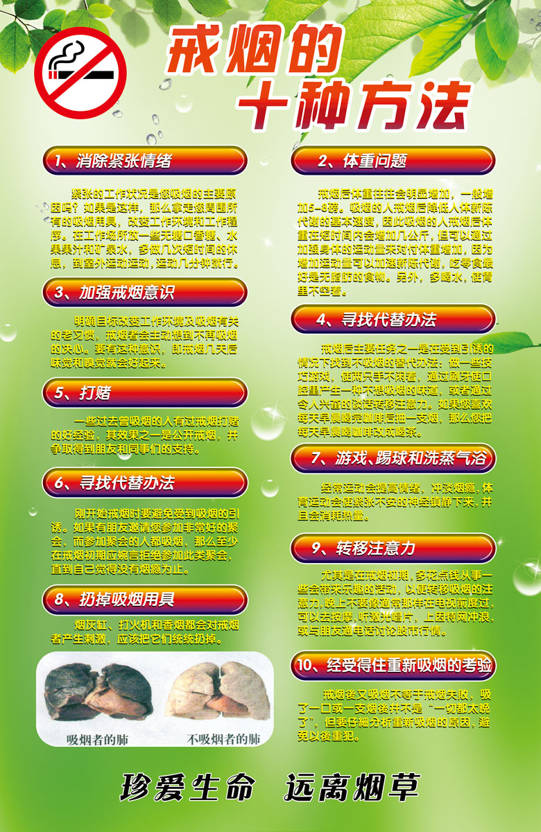 16、日常生活中,很多男性朋友都吸烟,有些还有烟瘾,大家都知道吸烟对身体的伤害是很大的,有些人想戒烟又戒不掉,该如何是好呢?戒烟的最好方法有哪些呢?下面教大家戒烟8个窍门,让烟瘾烟消云散,赶紧来看看吧窍门1在随身携带的小镜子上贴上自己肤色黯淡牙齿发黄的照片看到它,也许会使你抽烟的。