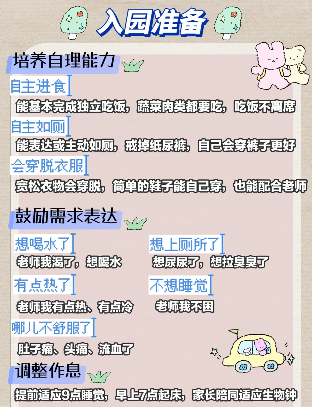 为了确保孩子顺利适应幼儿园生活,家长在孩子入园前应做好以下准备1 心理准备家长应帮助孩子建立积极的幼儿园印象,通过参观幼儿园与老师沟通等方式,让孩子对即将到来的学习生活充满期待2 基本生活自理能力培养教导孩子学会自己穿衣吃饭上厕所等基本生活技能,这有助于孩子更快地适应幼儿园。