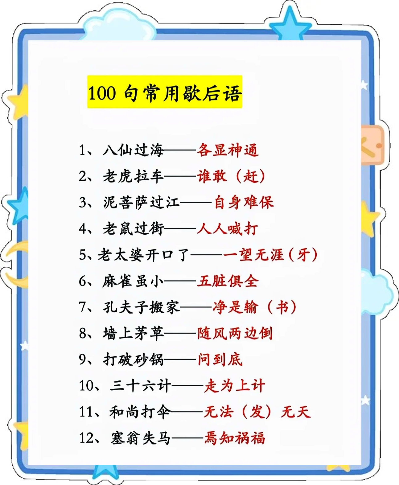 汉字是中国传统文化的瑰宝,有着悠久的历史和丰富的内涵在日常生活中,我们经常用到一些汉字歇后语,它们不仅能够让我们轻松愉快地学习汉字,还能够增加我们的语言表达能力,让我们更具幽默感下面是一些常见的汉字歇后语1 人山人海山字形容人多得像山一样2 一日三省吾身省字每天。
