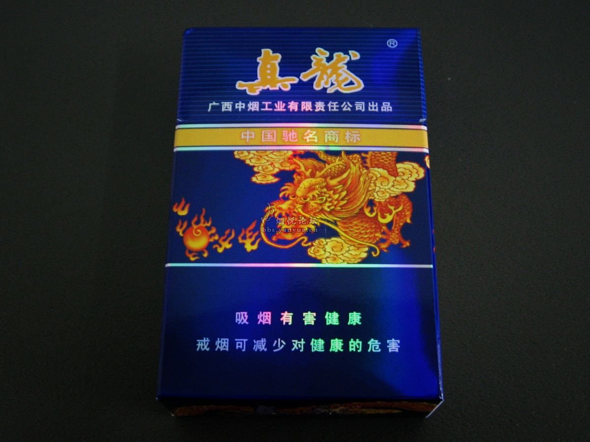 市面俗称蓝真龙或者5元真龙销售价格为5元主图案深蓝色打底,以明清艺术官服为设计为蓝本正面有一条圆形详龙,加与两条侧纹龙,三龙共戏珠背景为飘浮的详云底面为花生银海烟盖处有真龙两广告字下表为广西中烟工业公司出品焦油量12mg 烟气烟碱量13mg 烟气一氧化碳量12mg。