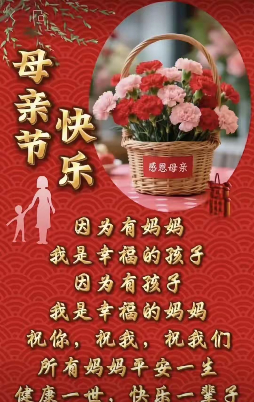 1、1 温馨日常型妈妈,您每天为我和这个家操劳,洗衣做饭照顾生活,每一个细节都满是您的爱母亲节到啦,希望您能歇一歇,多为自己考虑,愿您每天都开开心心,笑容比花还甜2 感恩成长型妈妈,成长路上多亏有您小时候您教我走路说话,耐心解答我的每一个问题长大后您又默默支持我;烦心琐事都拿下有您的关怀,千山万水都繁华,亲爱的妈妈,母亲节里愿您幸福安康,万事吉祥,我爱您9愿母亲十分的快乐,二愿母亲百分的幸福三愿母亲千分的开心四愿母亲万分的健康五愿母亲亿分的美丽亲爱的妈妈,母亲节快乐10母亲节,祝福亲爱的妈妈,健康长寿,事事顺心;7谢谢宝贝,你也是我最爱的女儿母亲节给我送来祝福,让我感到非常温暖和幸福我们一起度过每一天都是我生命中最珍贵的时光我永远爱你,谢谢你的祝福8亲爱的女儿,谢谢你的祝福看着你长大成人,我感到非常自豪和欣慰你是一个聪明可爱善良的女孩,我相信你一定会在未来的道路上取得。