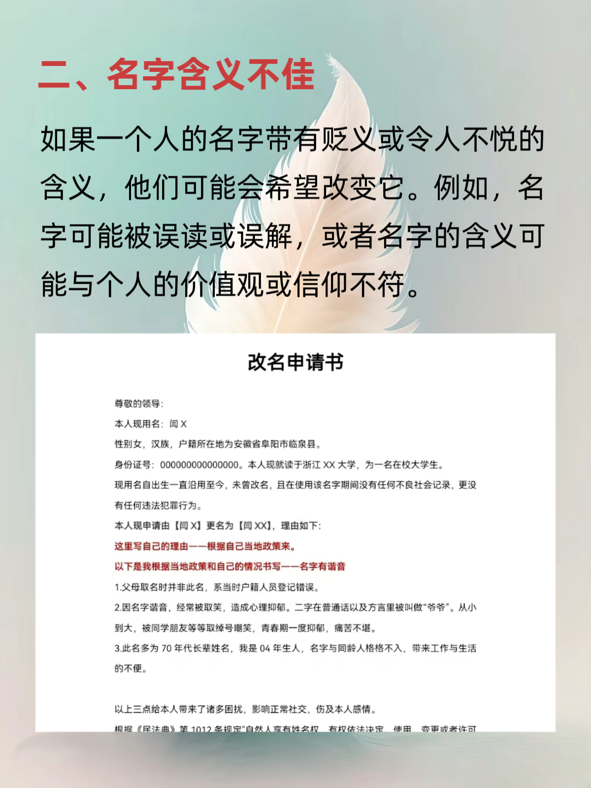 改名字的理由要写得清晰合理且符合规定,才容易通过以下是一些建议1 理由要充分且合理 谐音问题如果名字存在谐音,且该谐音容易引发误解嘲笑或对个人生活造成困扰,可以明确指出例如“我的名字存在不良谐音,经常受到他人的误解和嘲笑,对我的心理和生活造成了负面影响” 重名问题如果。