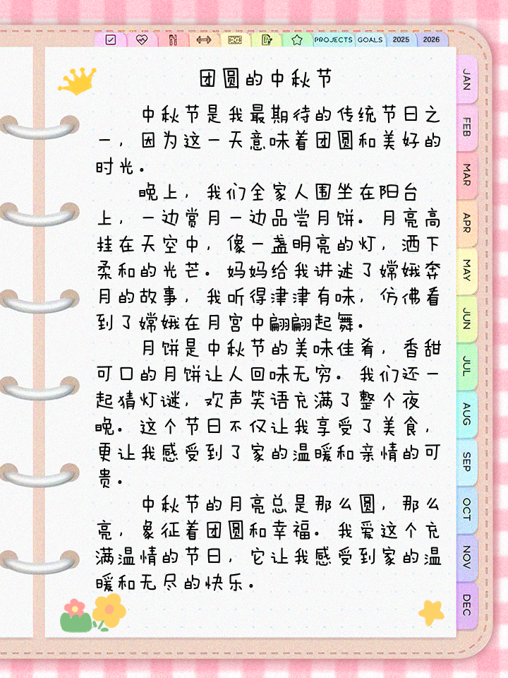 5、1我坐在阳台上,和家人一起品尝着美味的月饼,观赏着夜幕逐渐降临,天空中的明月缓缓升起奶奶说,边赏月边吃月饼,眼睛会变得更加明亮我注视着月亮,想起了嫦娥奔月的传说又拿起一块桂花月饼,轻咬一口,眼前仿佛出现了满园的桂花,连月亮上的花纹也仿佛是吴刚伐桂玉兔捣药的景象2在这个。