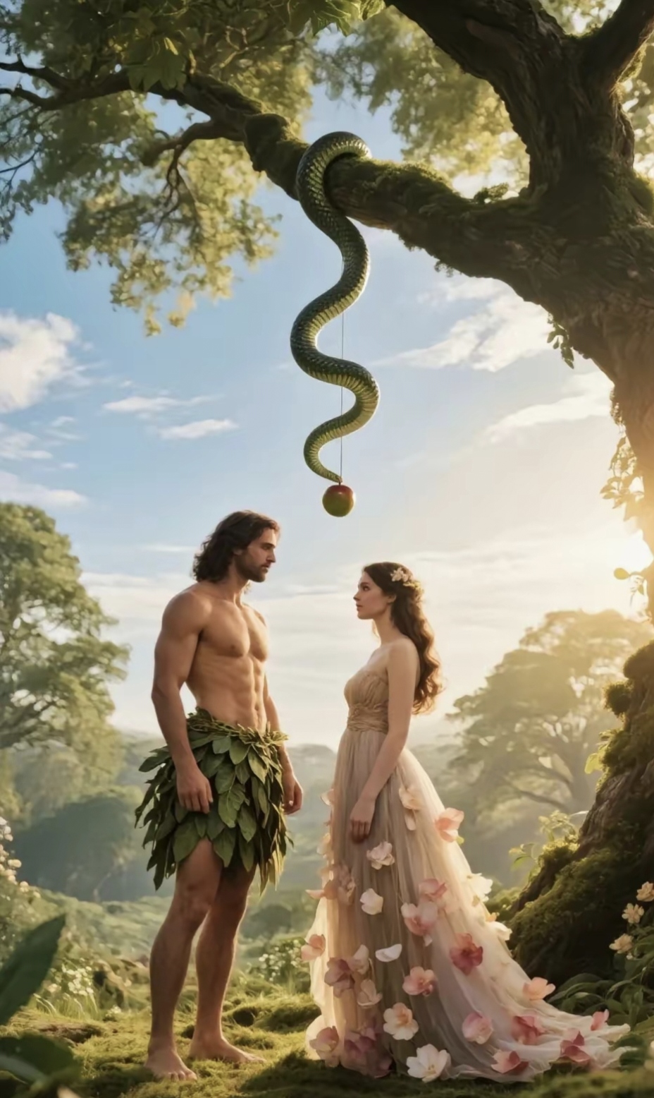 4、神赐亚当和夏娃居住在伊甸园,园中所有果物皆可品尝,唯有分别善恶树上的果子不得触及蛇诱惑夏娃,声称吃果子不会死,反而能明辨善恶,夏娃因受惑,违背神命,与亚当一同食用禁果果子让二人认识了恶,产生了抱怨与推卸责任的想法神询问亚当,亚当将原因归咎于夏娃,神又责问夏娃,她承认是蛇引诱了。