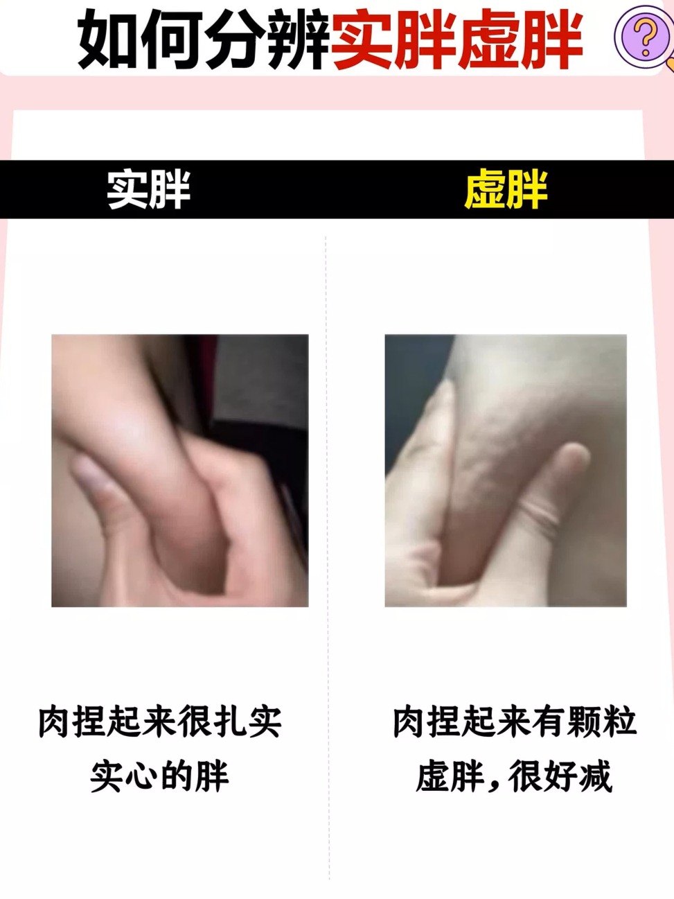 9、1 虚胖和真胖在身体肉质上有所不同虚胖的人肉感柔软,减肥相对容易,而真胖的人肉感结实,减肥较为困难2 饮食方面,虚胖的人往往食量不大,容易感到饱腹,而真胖的人则总想吃更多此外,虚胖的人可能体质较弱,而真胖的人体格通常较为健壮3 虚胖的人在蹲下时可能会有小腿肿胀的感觉,这也是与真胖的一个明显区别4 从中医角度来。