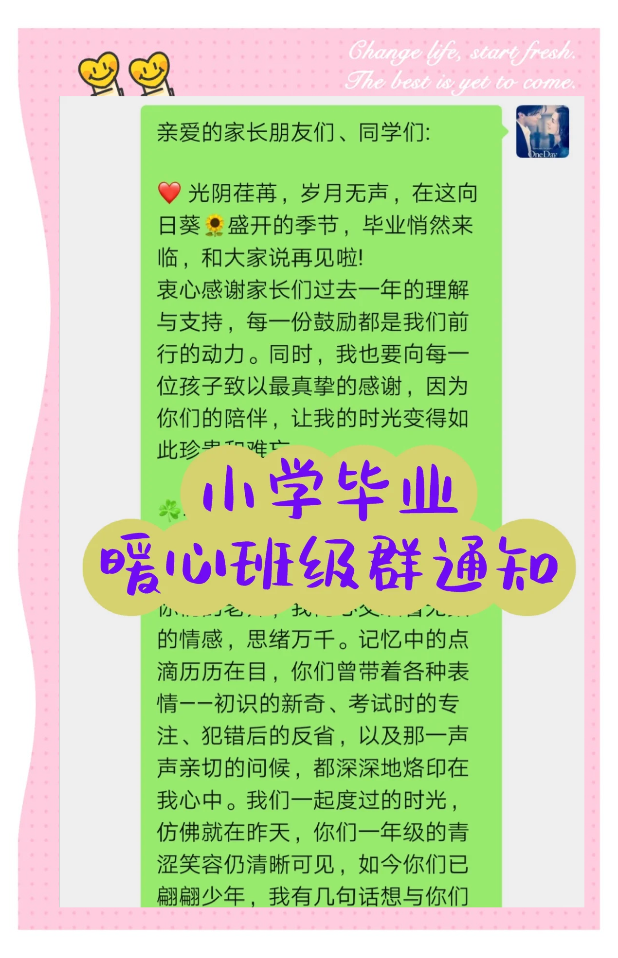 55就要上小学了,老师觉得你如果再勇敢一点,平时多与老师积极交流,那将会变得更加能干 56亲爱的你们,在这毕业季,虽然对你们有万般不舍,但是你们有属于你们的天空,希望你们走出去后在音乐的海洋里都能闯出自己的一片天 57又是一年毕业时,大学的同学们就要分别了,为您送上大学毕业祝福语大学毕业祝福;既然如此,寄语的短句比较适用哪些呢?我特地为您收集整理“小学毕业父母寄语精选实用”,欢迎阅读,希望您能阅读并收藏 #x2003#x20031你度过了学习生涯的第一个学年,你的努力爸爸妈妈看到了,你是最棒的!冰倩,你在这学期中成绩虽优秀,但总是伴随着马虎粗心希望你在新的学期中做到一步有一个脚印,认真扎实的学好;6老师的毕业寄语火了,难忘的校园时光,带着难忘的师生情怀,在这即将毕业的日子里,我把最真挚的祝福送给我最尊敬的人愿我的老师们永远健康平安,天天快乐!毕业感谢老师的话简短 7毕业生们请拿好这张专属 8形成了一份独具特色的礼物 9#x00BB重磅!浙江教育“十四五”规划来了! 10三年的时光弹指一挥。