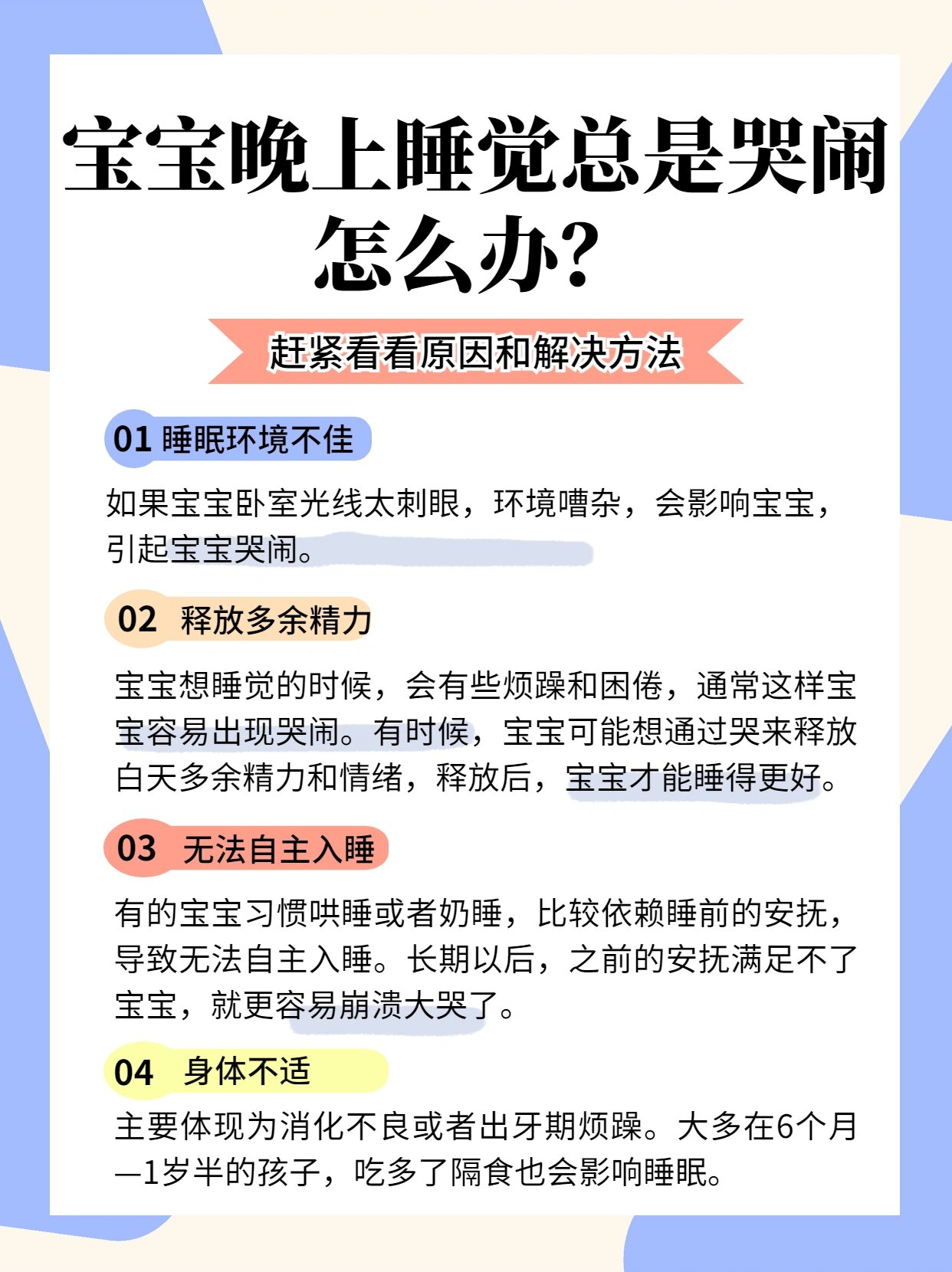 **念咒语**在一些地方,人们相信通过念特定的咒语可以安抚宝宝的情绪,如“一不小,二不深,三清皇母娘娘抱儿孙,前世父母来打听,今世父母笑来临”虽然这种方法缺乏科学依据,但在一些家庭中仍然被广泛使用 **贴红纸**有些地方认为在家中贴上红纸可以驱邪避凶,从而减少宝宝的夜哭现象。