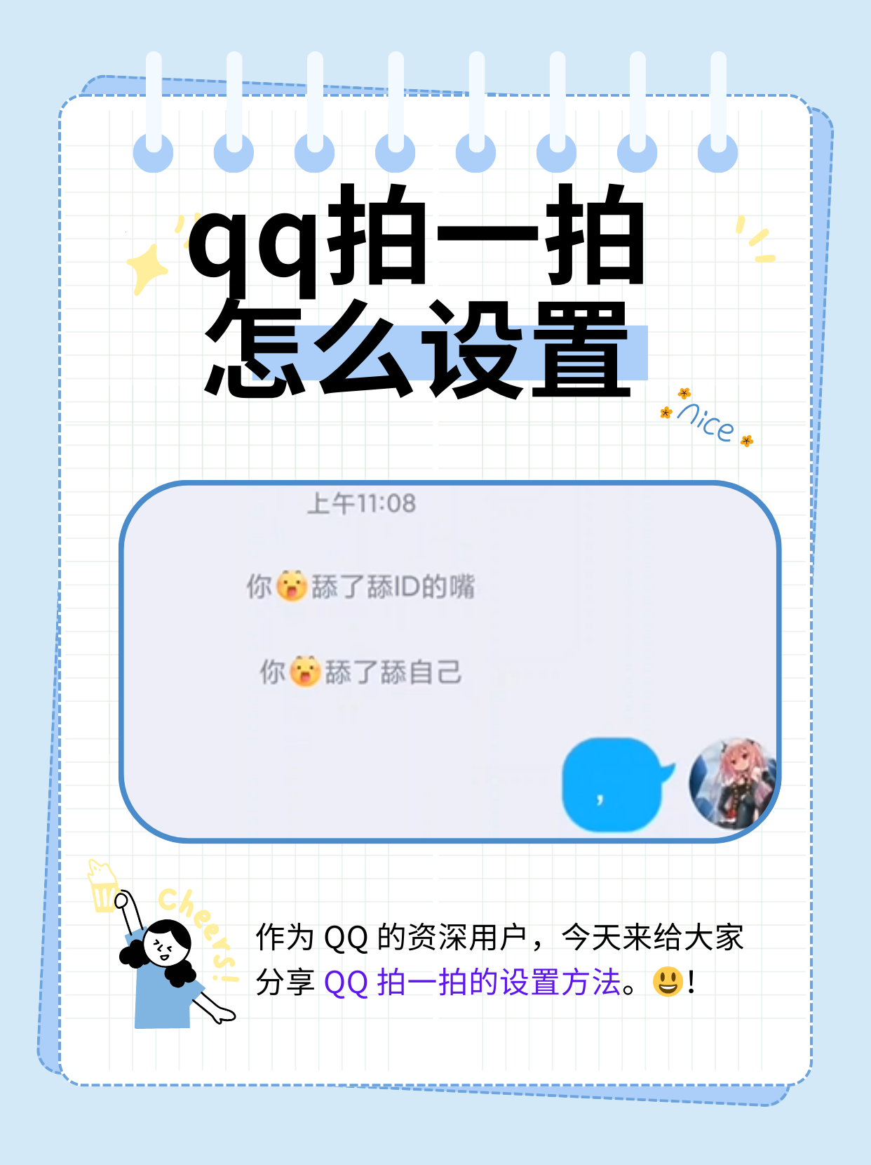 首先将微信升级至最新版本,然后打开“微信”客户端,接着点击右下角“我”图标,点击上方个人头像,再点击“拍一拍”,在“朋友拍了拍我的”后方输入“脸并亲一下”,最后点击“完成”,此时好友在聊天页面双击你的头像就会显示“你的好友拍了拍你的脸并亲一下”拍一拍,是微信的一个功能将;1 打开微信,在底部导航栏中找到并点击“我”的图标,进入个人中心页面2 在个人中心页面中,点击自己的头像,进入个人信息设置页面3 在个人信息设置页面下方,可以找到“拍一拍”选项,点击进入4 在“拍一拍”设置页面中,可以输入想要设置的拍一拍内容,完成后点击“确定”或“完成”按钮;1点击打开“微信”2选择点击“我”3点击“微信号”,选择“拍一拍”5进入自定义完成后点击“完成”即可微信的小技巧1朋友圈点赞不提醒 微信朋友圈的最大“Bug”,就是点赞某位好友后,如果后续还有点赞,就会不停地收到“通知提醒”很简单,只要长按该消息的点赞通知。