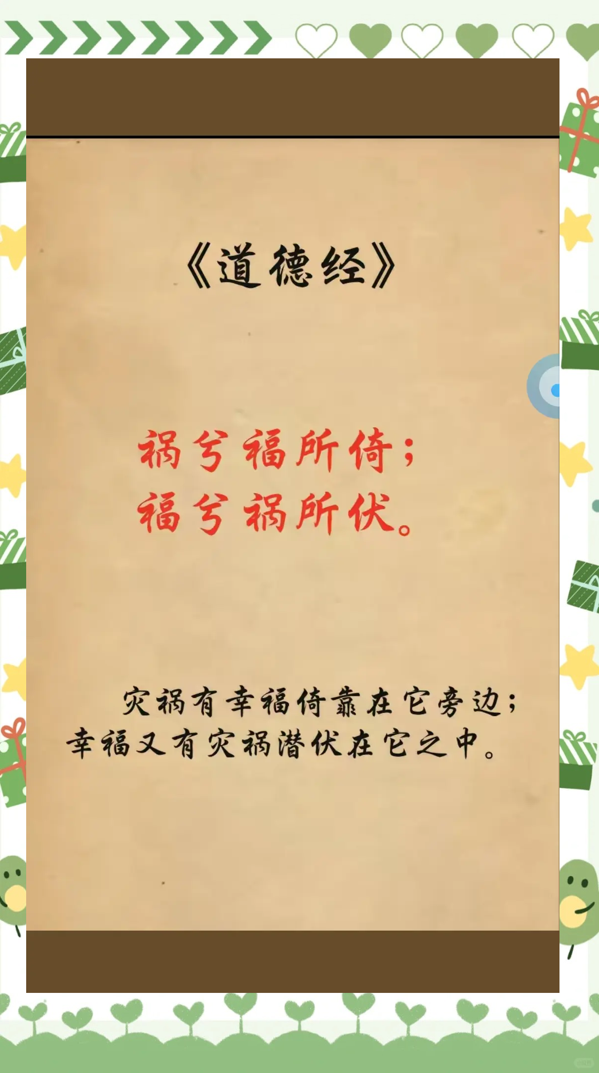 祸兮福之所倚,福兮祸之所伏灾祸啊,它往往隐藏在福气的背后而福气呢,也往往潜伏在灾祸之中谁能知道这种转化祸福相依的终极状态呢其实并没有一个固定的标准其无正来判断何时是祸何时是福正复为奇,善复为妖如果过分依赖刑政威权来治理国家正,那么最终可能会导致采取诡变;老子 五十八章其政闷闷,其民淳淳其政察察,其民缺缺祸兮福之所倚,福兮祸之所伏孰知其极其无正正复为奇,善复为妖人之迷,其日固久是以圣人方而不割,廉而不刿,直而不肆,光而不耀试译政策宽松一点,百姓就淳朴一点政策苛刻一点,百姓就躲避一点祸嘛,里头;这句话出自于老子第五十八幸原文是“祸兮福之所 倚,福兮祸之所伏”经过简化,也可写成“祸兮福所倚,福兮福所 伐”,意思是一样的句中的“兮”是语气词,相当于“啊”,没有 实际意义“倚”是倚傍“伏”是潜藏隐匿这#可直译为灾 祸啊,幸福依傍在它的旁边幸福啊;祸兮,福之所倚福兮,祸之所伏 自解 灾祸,也许接下来就是幸运了福分也许有灾祸潜伏着孰知其极其无正也正复为奇,善复为妖人之迷,其日固久 自解 这些是没有边界标准的,正可以转变为奇,奇可以转变为正,善和恶也是可以相互转变的人们的迷惑由来已久是以圣;1 文言文翻译“祸兮福之所倚,福兮祸之所伏” 出自老子·五十八章“祸兮福之所倚,福兮祸之所伏”直接翻译是祸,是福存在的根本理由,福运,则总是隐藏在祸患之中祸与福,虽然通常人们的认知范围内是两个对立的概念,本质上其实是互相依存,可以互相转化的常用来比喻坏事可以。