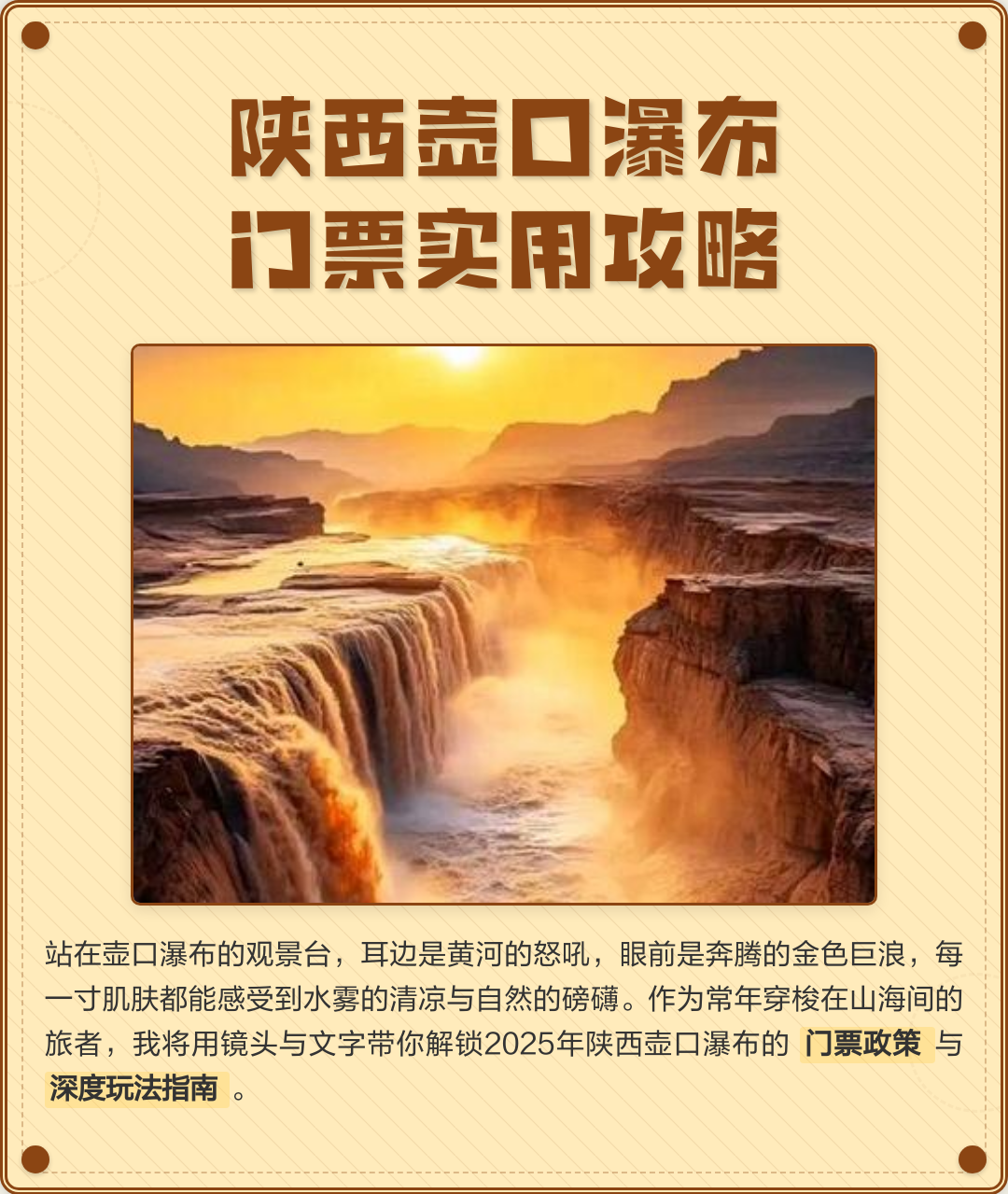 这个时期被称为“壶口秋风”此时瀑布的水流达到最大水平,瀑布非常壮观,是规模最大的时候在秋季观赏壶口瀑布,可以看到黄河水奔腾汹涌,犹如大海咆哮而来,给人带来强烈的视觉冲击和心灵震撼综上所述,春秋两季是壶口瀑布的最佳观赏时期这两个季节不仅瀑布本身景观迷人,周边的自然景色也相得益彰;壶口瀑布的最佳游览时间为每年的5月至10月,尤其是7月至8月的汛期,此时水量充沛,瀑布最为壮观最佳季节详解 1 汛期78月黄河水量大增,瀑布宽度可达百米,水雾冲天,气势磅礴,是摄影和观景的黄金时段但需注意安全,部分观景区域可能因水位过高临时关闭2 春秋季56月910月;黄河壶口瀑布的最佳观赏时间为春季4至5月和秋季9至11月春季4至5月,正值农历三月间,被称为“三月桃花汛”此时漫山遍野山桃花盛开,岸边冻结的冰崖消融,加上冰雪融化使水源增多,形成更大水流,瀑布显得更加壮观水大而稳,瀑布宽度可达千米左右,远远望去,烟波浩渺,大浪卷着水泡,奔腾咆哮,以。