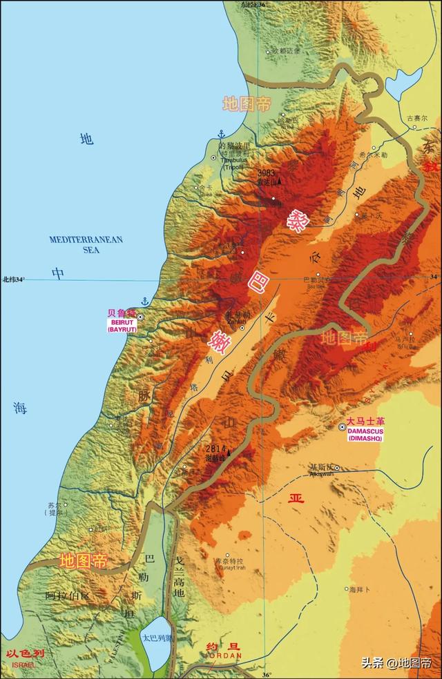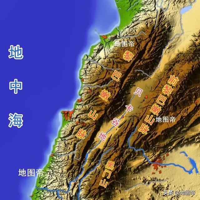 黎巴嫩西濒地中海,海岸线长约220千米。黎巴嫩东部是前黎巴嫩山脉,这是黎巴嫩与叙利亚的界山,最高峰谢赫峰,海拔约2814米。黎巴嫩境内有黎巴嫩山,最高峰索达山,海拔约3083米,位于黎巴嫩山北部。前黎巴嫩山脉与黎巴嫩山脉之间,有一个贝卡谷地,长120千米,平均宽约16千米。贝卡谷地流淌利塔尼河,这里土地肥沃,气候温和,是黎巴嫩最大的农业区。