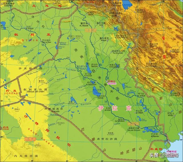 伊拉克位于阿拉伯半岛东北部,幼发拉底河和底格里斯河自西北向东南流贯全境,面积约43.83万平方千米,放在我国省级行政区中可排第八位。